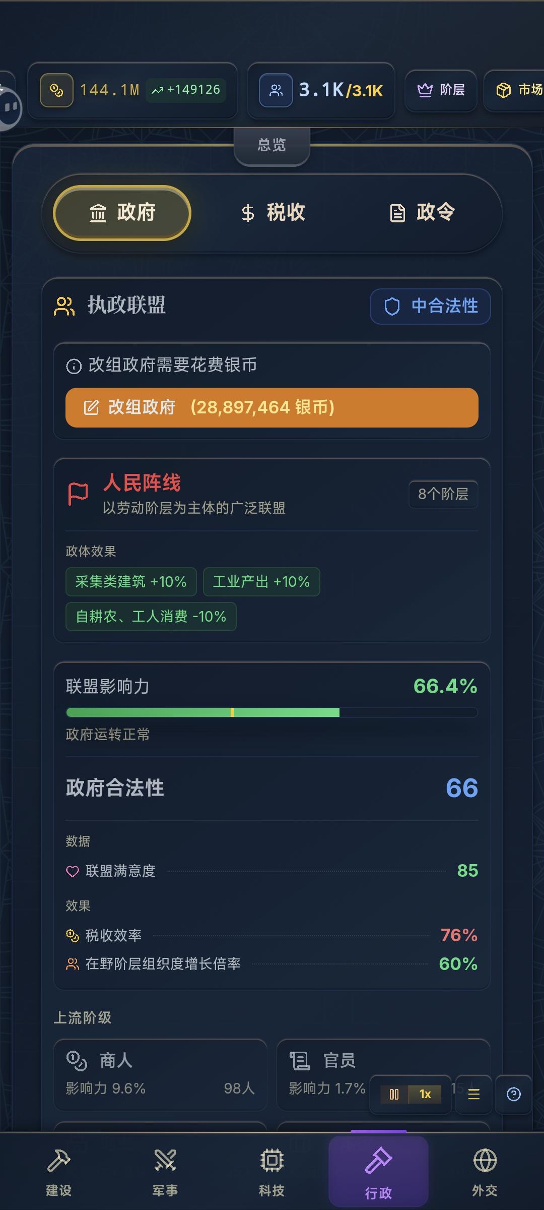 7️⃣这时会发现商人简直是暴利,别人都赚3-5,商人能赚20-400,狠狠给他们加人头税,让他们收入在10左右就行。引发阶层不满就减税、收买,平静之后加回来。我的商人一直是温饱水平,保证他们不闹事就行