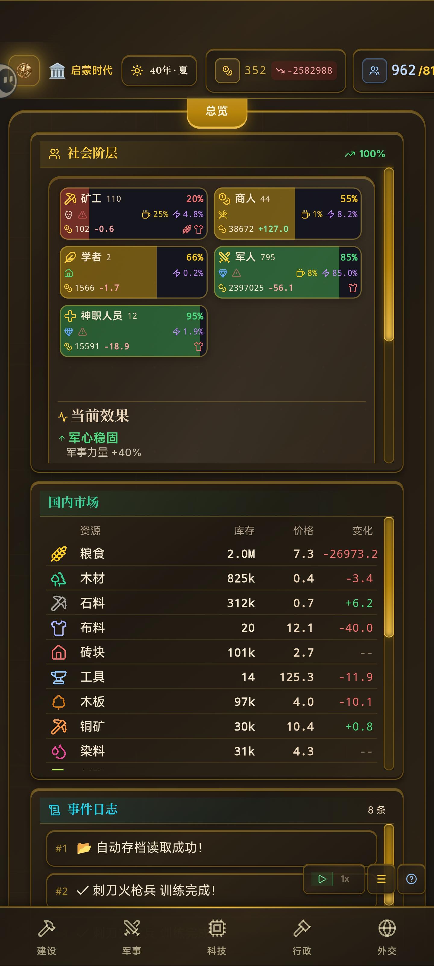 2 军事上不知道为什么感觉军队造价前期还蛮贵的,建议把兵种简化成类似eu4那种步/骑/炮三种,然后每个兵种随时代和科技解锁升级成更强的类型。再然后军事建筑感觉可以细化一下。