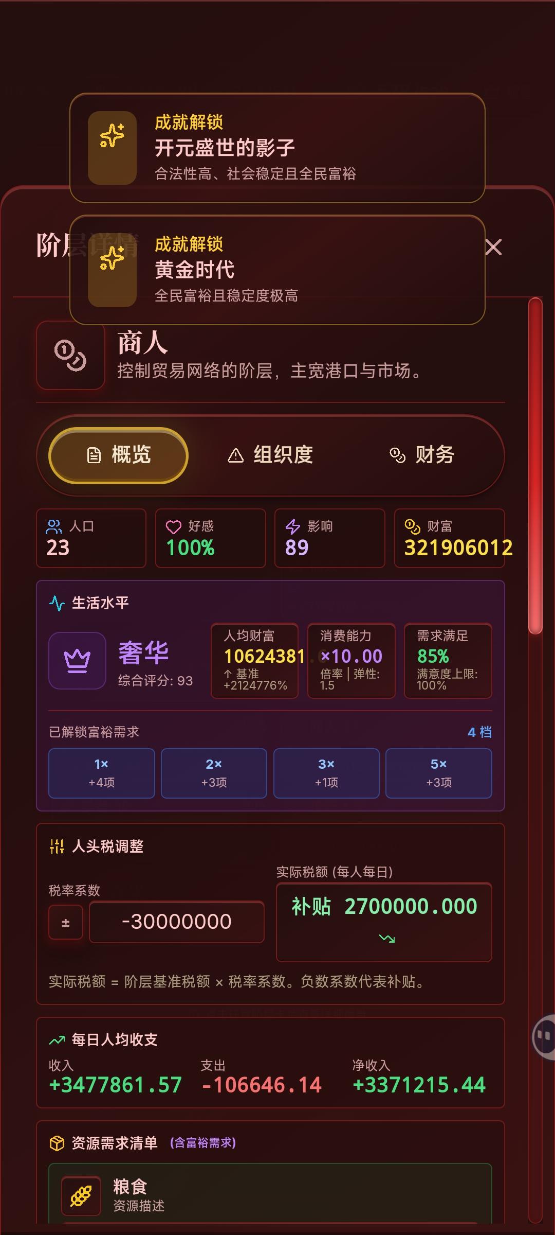 补一句,不能让你的人民太富裕,我注意到国内阶层富裕后,资源消耗量上升了,并随着越来越富裕,消耗速度越来越快,产品价格被人为制造的稀缺大量抬高了。必须控制非法哄抬物价,我的控制手段是对奢侈品交易施加重税,并随时关注市场基础物资价格,超过警戒线就对过度富裕阶层大量征税