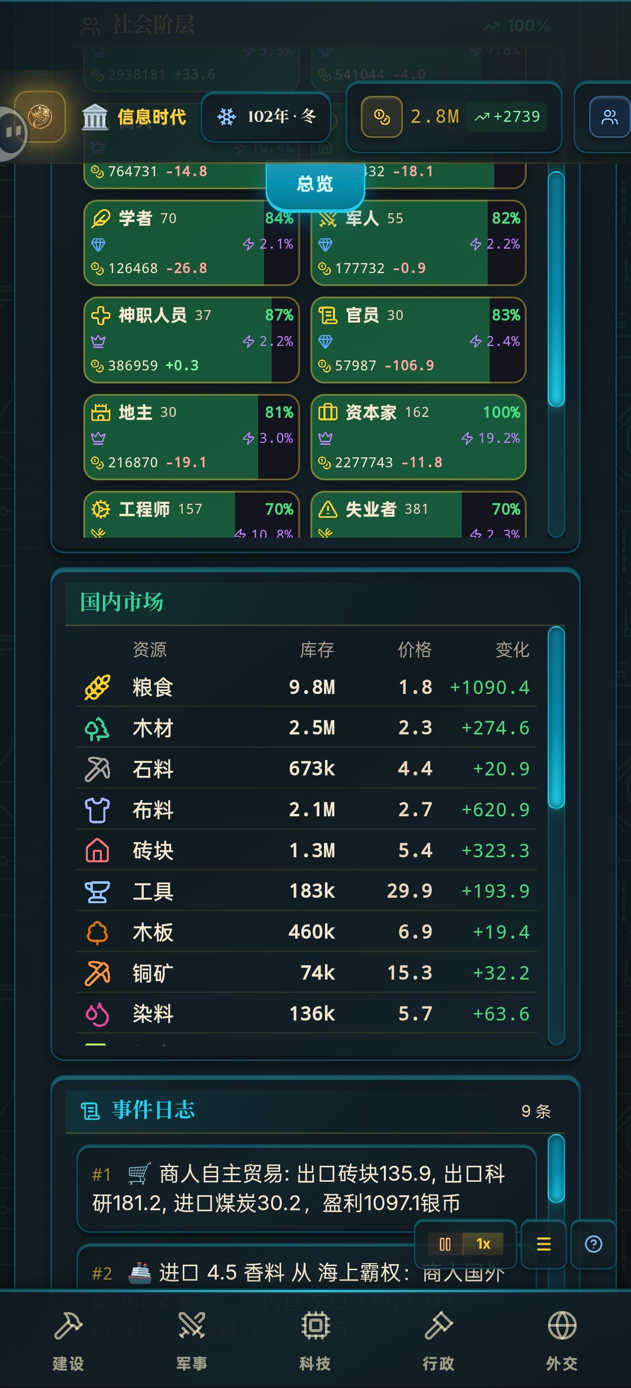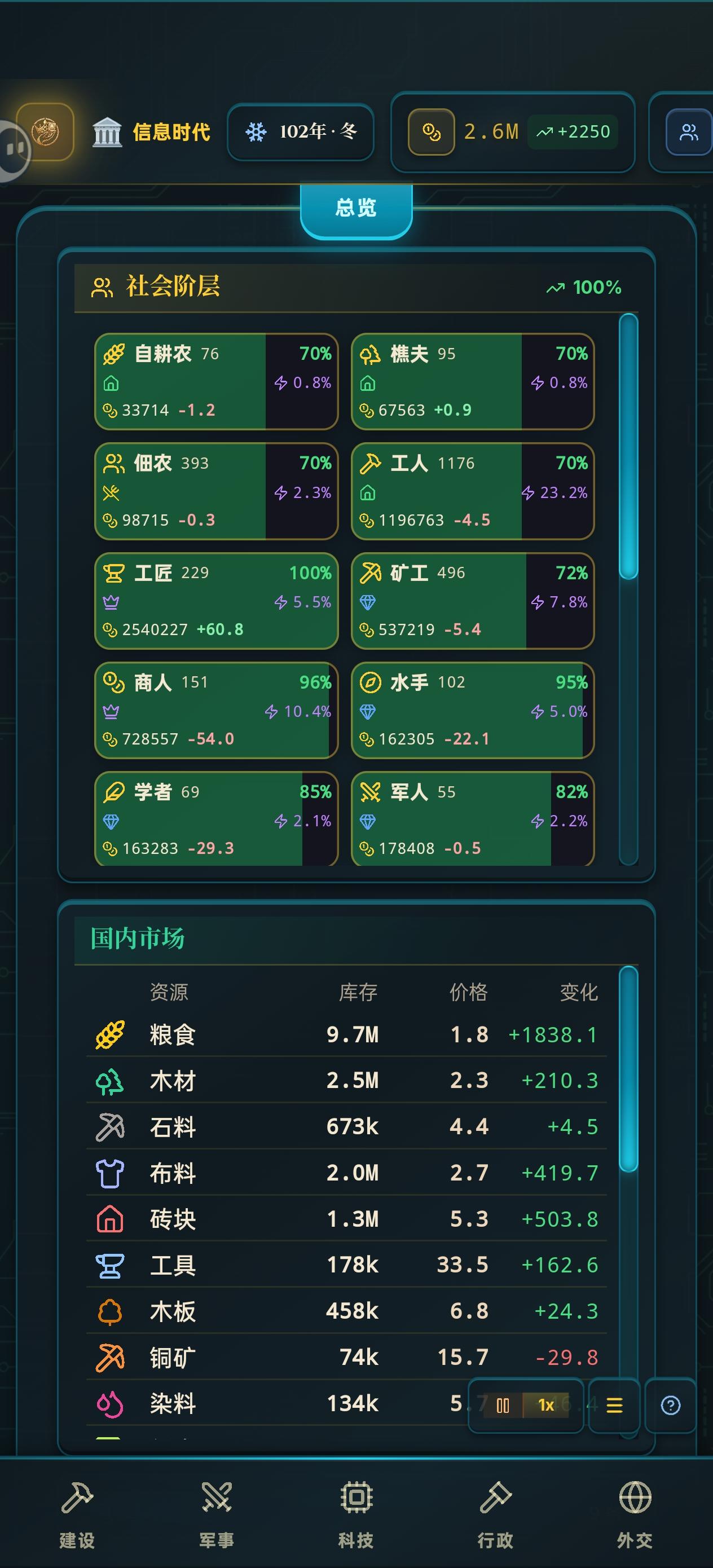 说点离谱的,人不能太有财富,太有钱就会各种资源消耗十倍,分分钟粮仓见底,然后社会供需失衡然后开始暴乱,太离谱了,前期时代只能一半人是绿的,全绿就会各种缺东西。