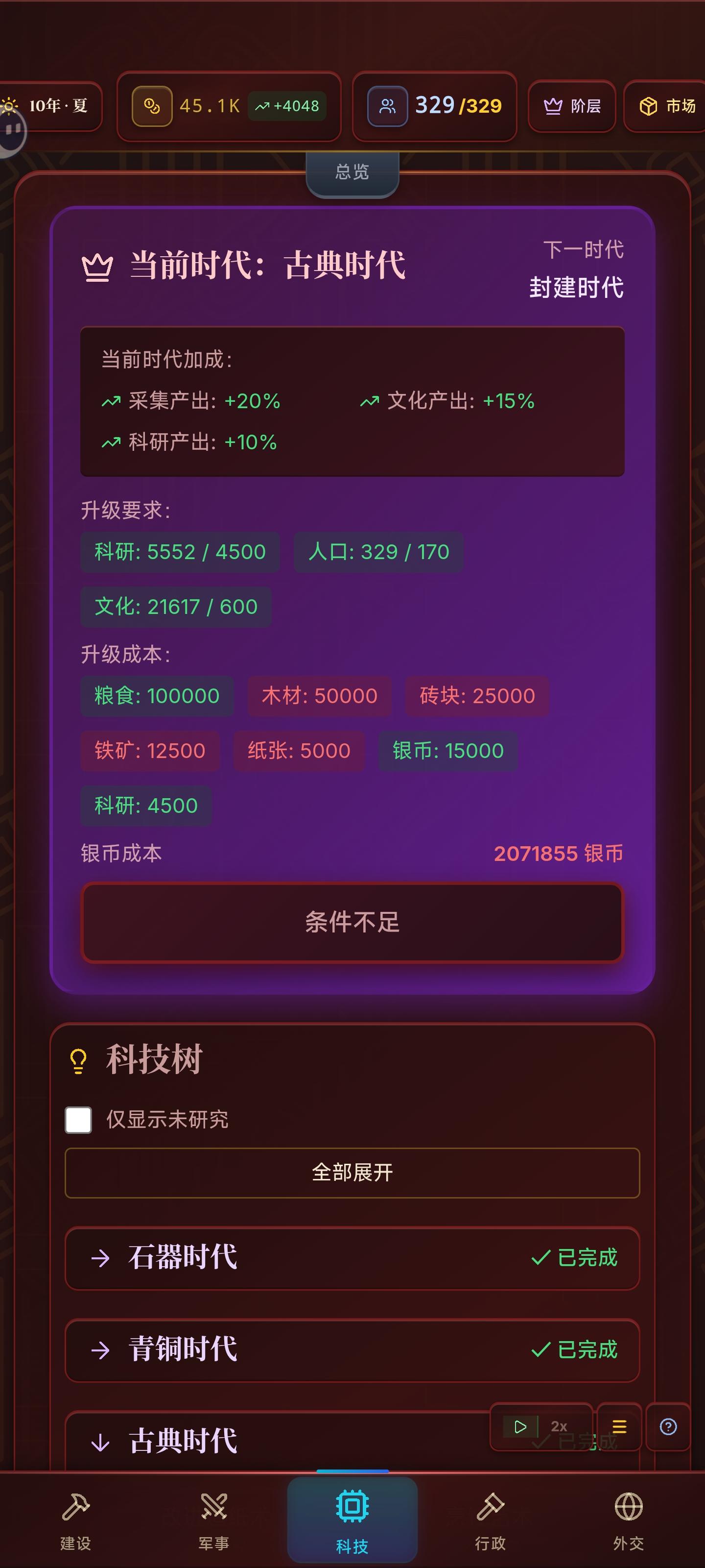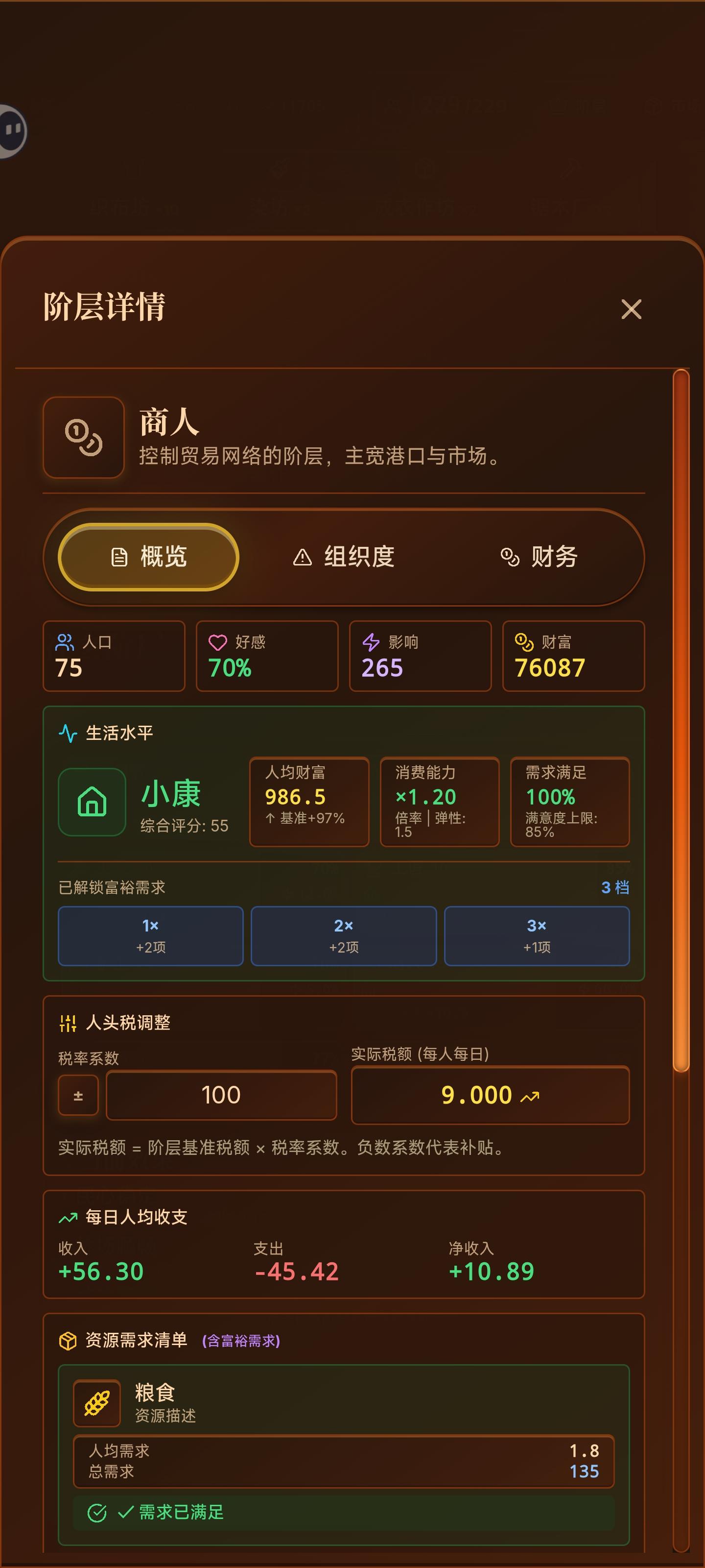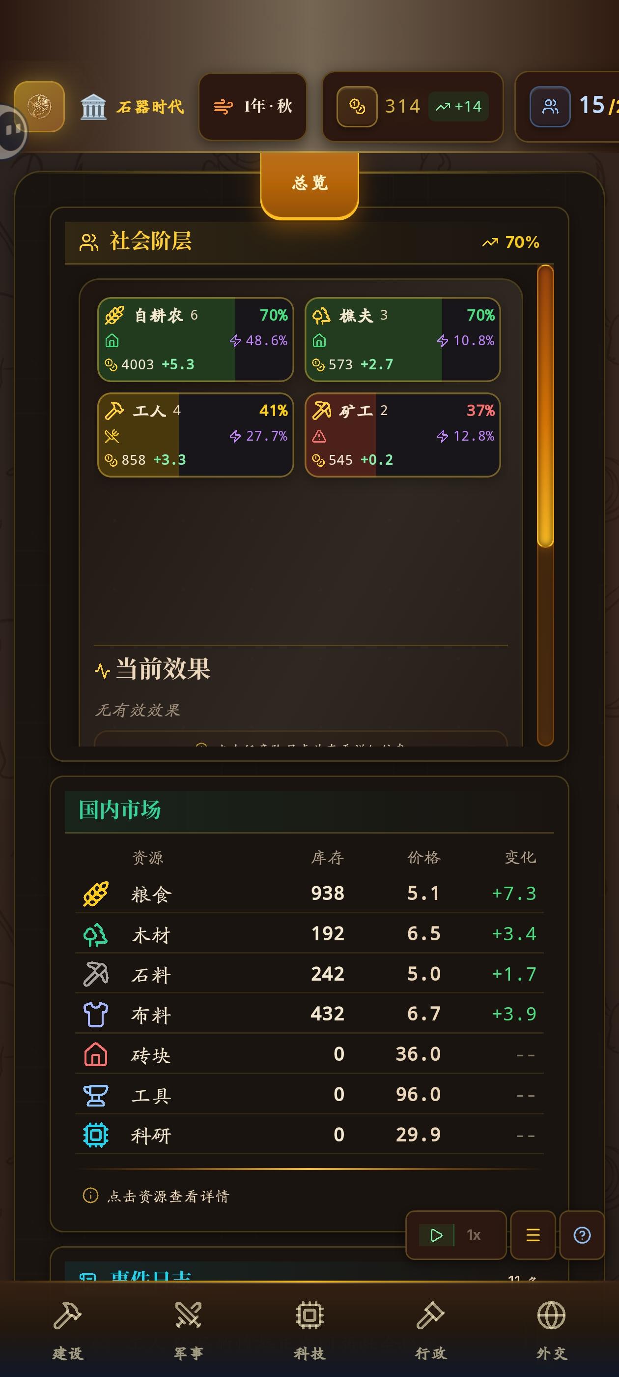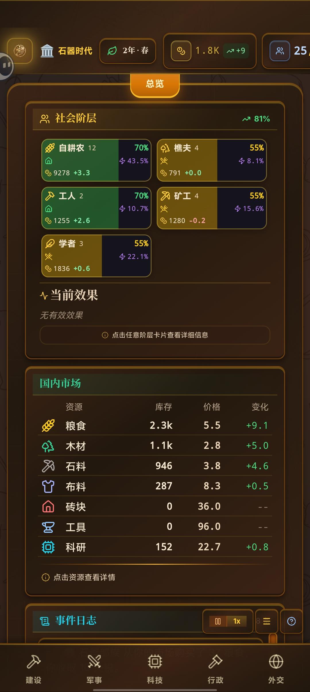 商人他居然还有的赚!商人纯底层逻辑了,开局点出贸易一会100%好感立马20,30,50,的加,然后这玩意居然还撑得住,我直接其他的全部不点了全给我TM拉贸易,他居然还能赚!而且又飙到100%!666,后面的解锁新东西我撑死就开一俩间,才五分钟不到跳俩个文明等级!!这才第八年就古典,逆天,然后直接净收益达到4000!!,商人那个好感度还在缓慢增加😂,这些玩意已经严重拖后腿了,干脆进口算了