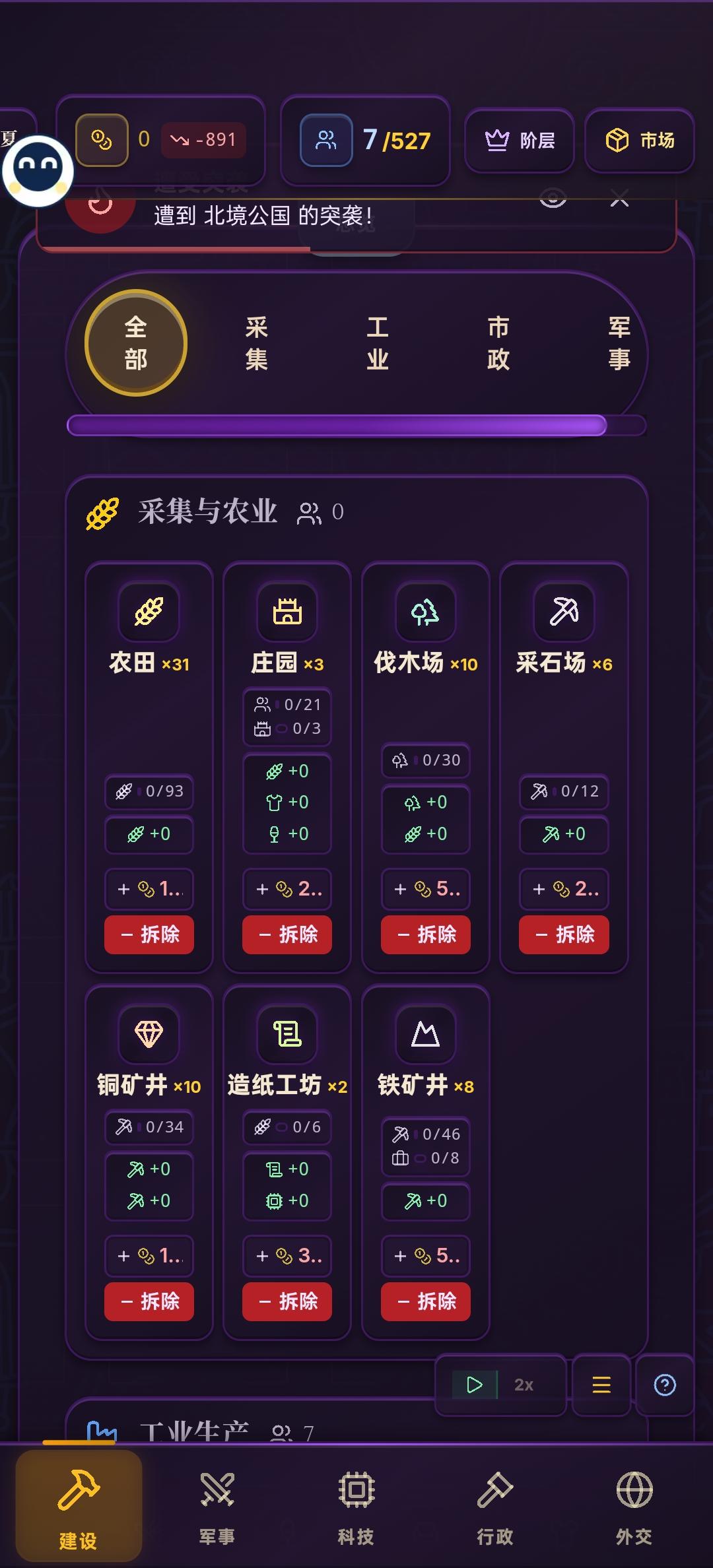 只要食物足够,这人就疯狂生,全面吸收了几个国家后,人口上限太高,把所有人口措施都拆了之后,还有3000人口,然后原住民不断地生失业者,为提供岗位,建设施,结果其他阶级又不满意,之后又是阶级矛盾,联合判乱,但又有很多食物,人杀的没生的快,同时又不断有国家攻击,最后直接顶着判乱,只攒钱,还升了两个时代,之后拆了所有措施,人死光了,但一建农田,人又开始生,又开始有失业者,算是死档了。