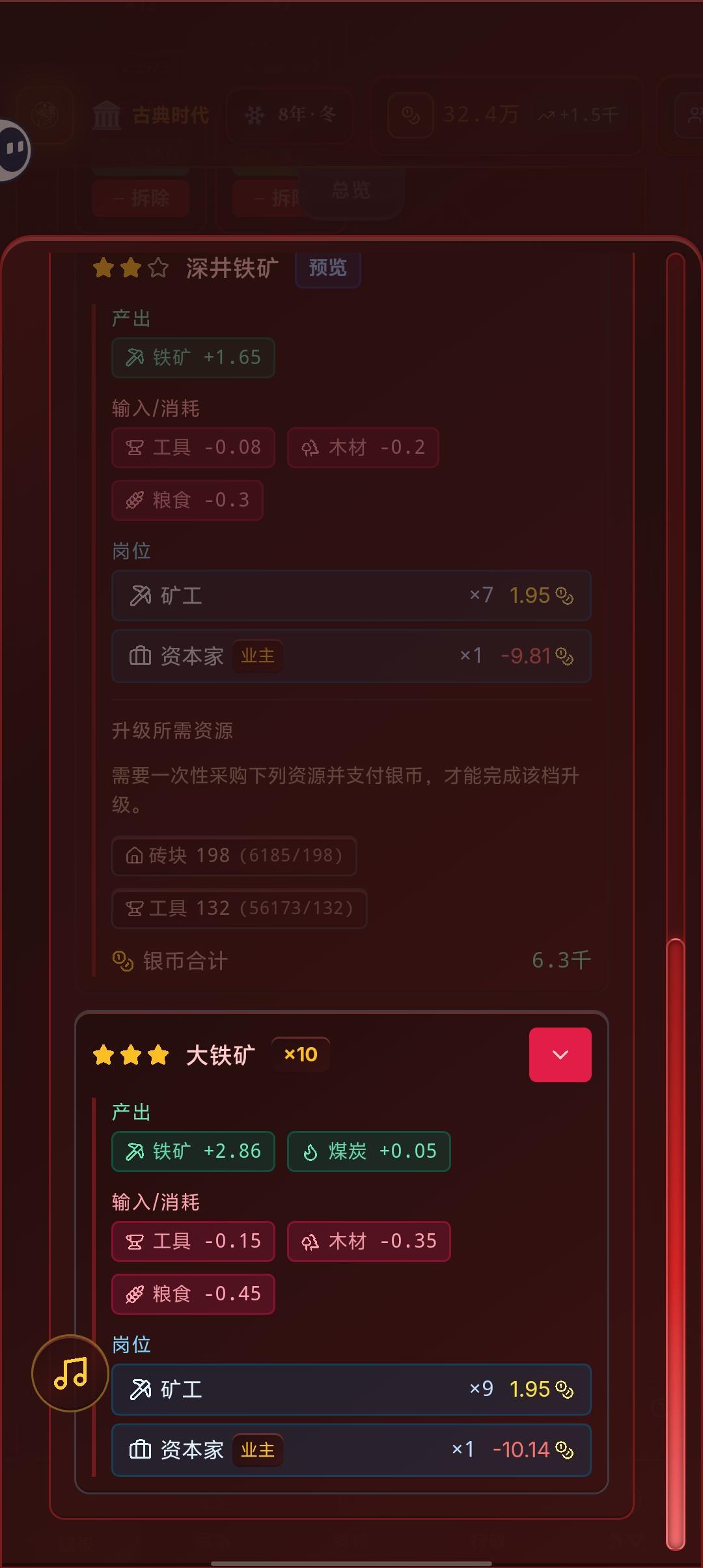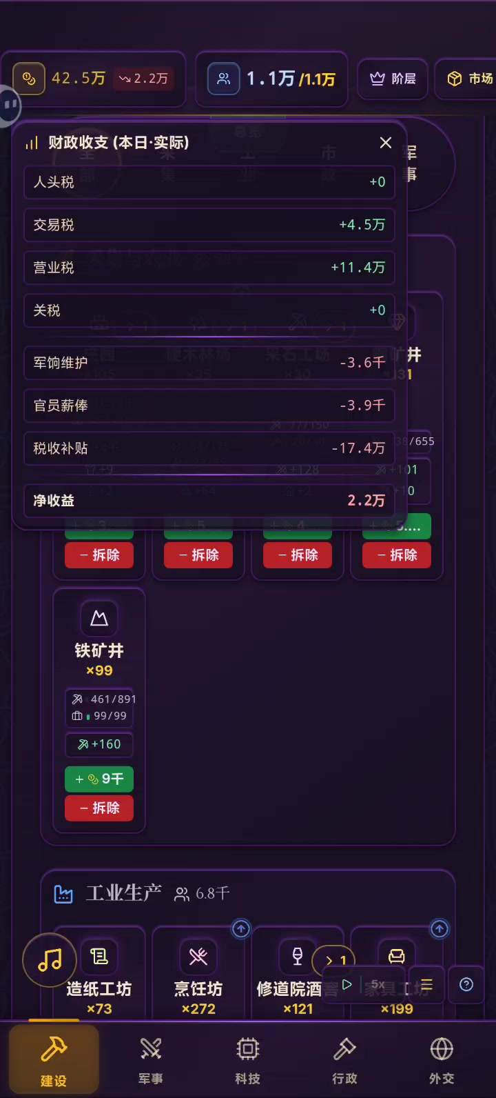 多个建筑从二级升三级的时候,单个人口产出反而下降了。系统还会自动升级3级建筑,建议取消自动升级。