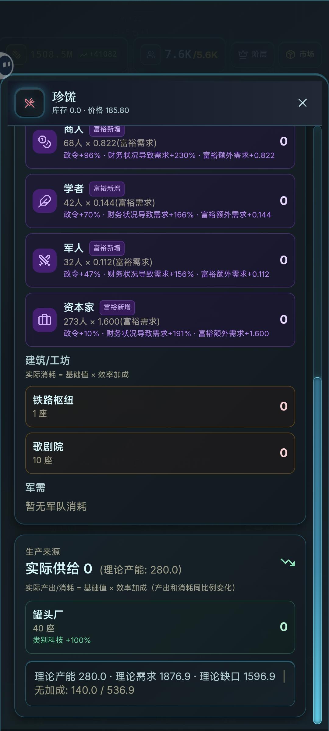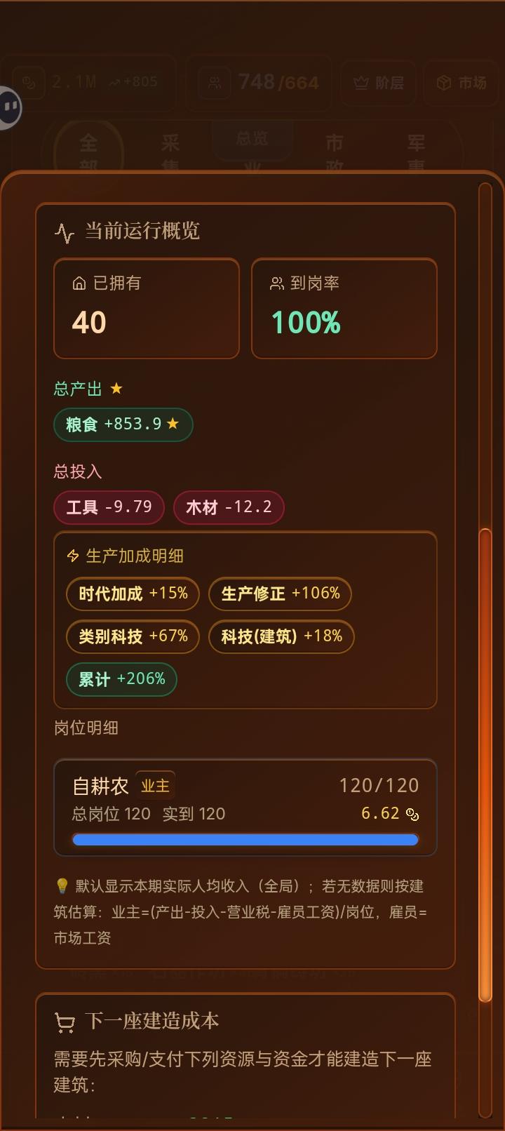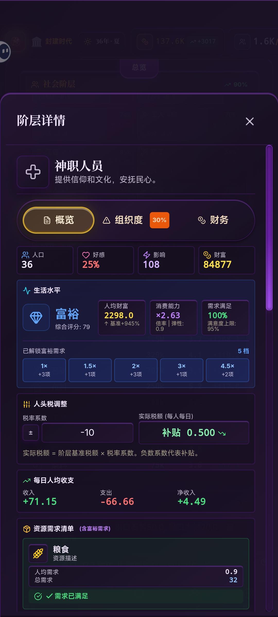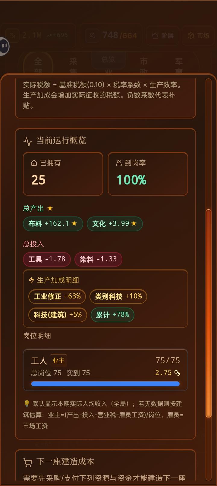 后期大量补贴各个阶层,就算是地主,资本家,商人也开了大额补贴拉高必须品,原料关税,不然商人宁愿自己饿死也要倒卖粮食有盈余但是建设需要的也不准出口消费品收50%税,鼓励出口(补贴出口貌似无用)有强大盈利能力的厂子也多收点税,这里其实还是少了些财政平衡百姓富足