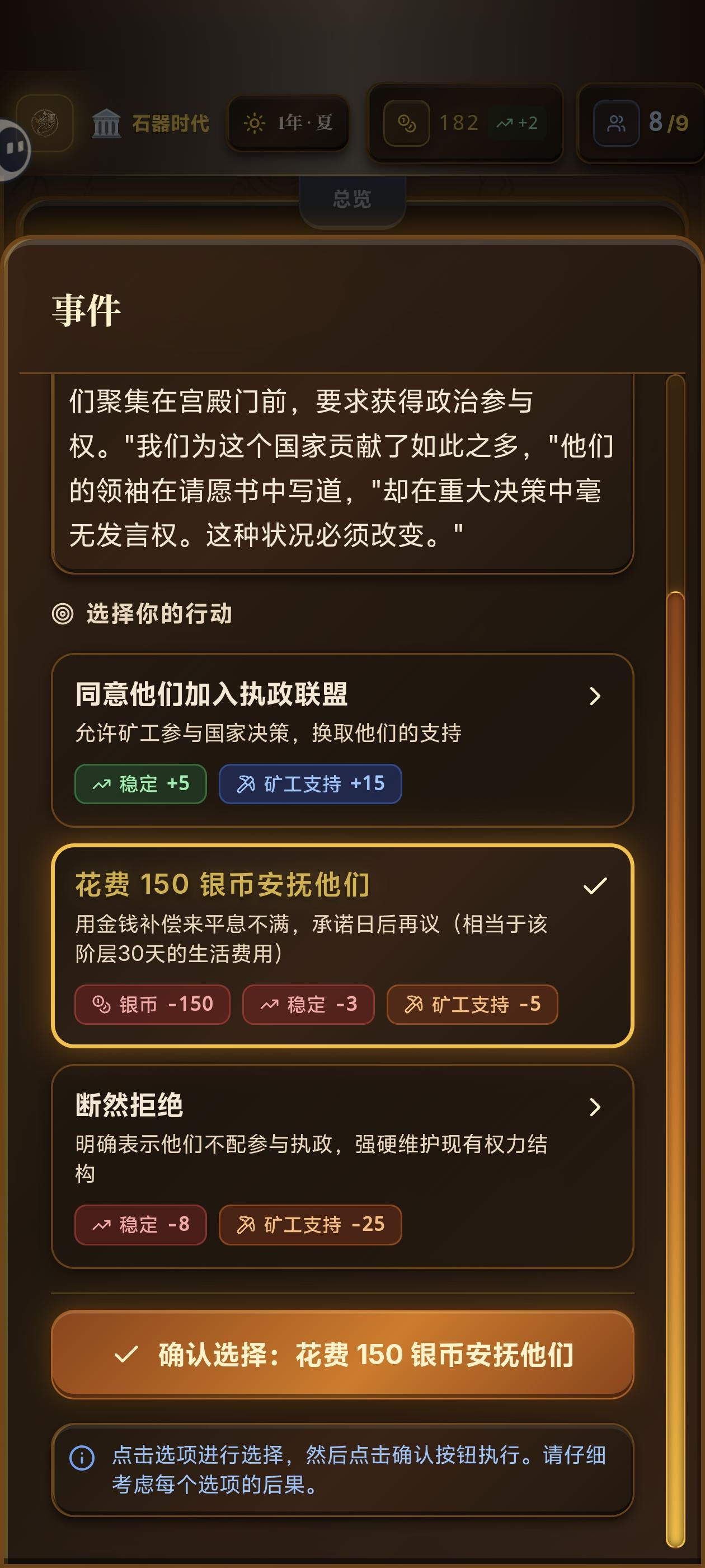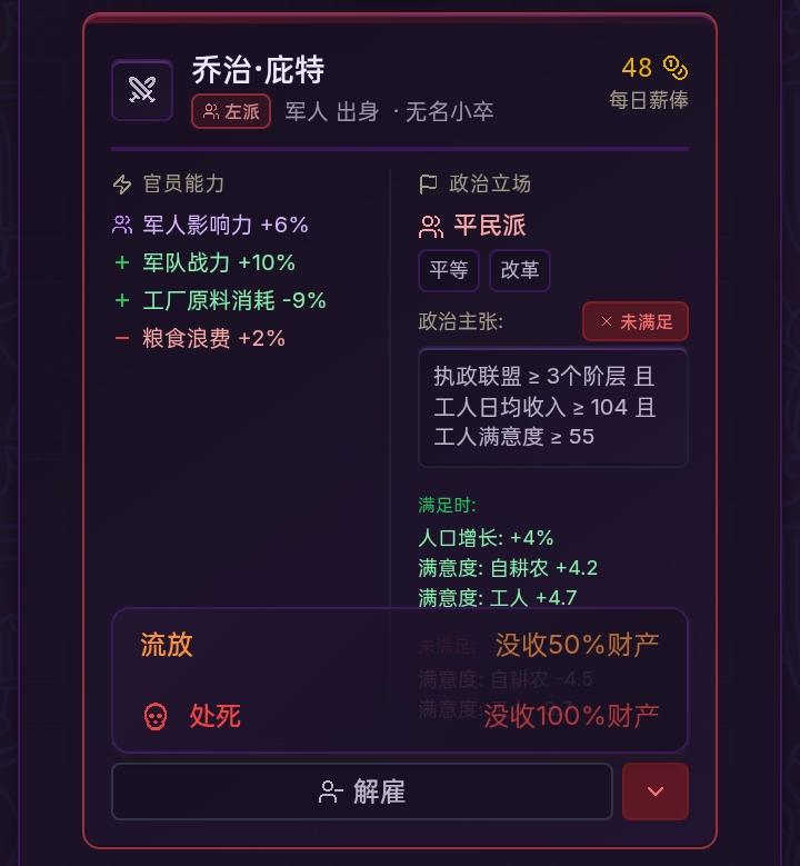 基础管理(人事部)1.招募与编制 选拔周期:每 180天(半年)可以进行一次选拔,每次提供5名候选人。 编制上限:你的内阁容量受时代、政体和科技(如文官制度、中央集权)影响。 提示:如果想组建强大的内阁,优先研发行政类科技。2.薪俸与效率官员不是免费的。 全额支薪:官员发挥 100% 的能力。 拖欠薪水:官员效果直接 减半(50%),且无法提供阶层影响力加成。3.威望系统每个官