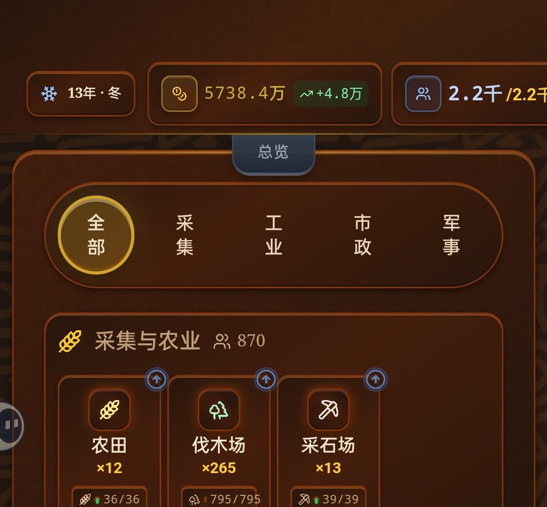 1,地主补贴我都拉到-1000了,还是没人干,导致好多要地主的设施全都生产不下去 2而且建议选项的时候不要流时间,尤其是打仗和做外交政策的时候,弄完的话时间都过好几年了, 3后期国家也是抽象,有的发展也太快了,战力都崩了 ,而且那个建筑升级我觉得做的也不合理 ,明明没增加多少东西,结果升级那么贵 ,不如不升 4人员满意度也奇怪,有的一年工资盈余500,1000多的人家满意度还下降 ,有的工资天天倒