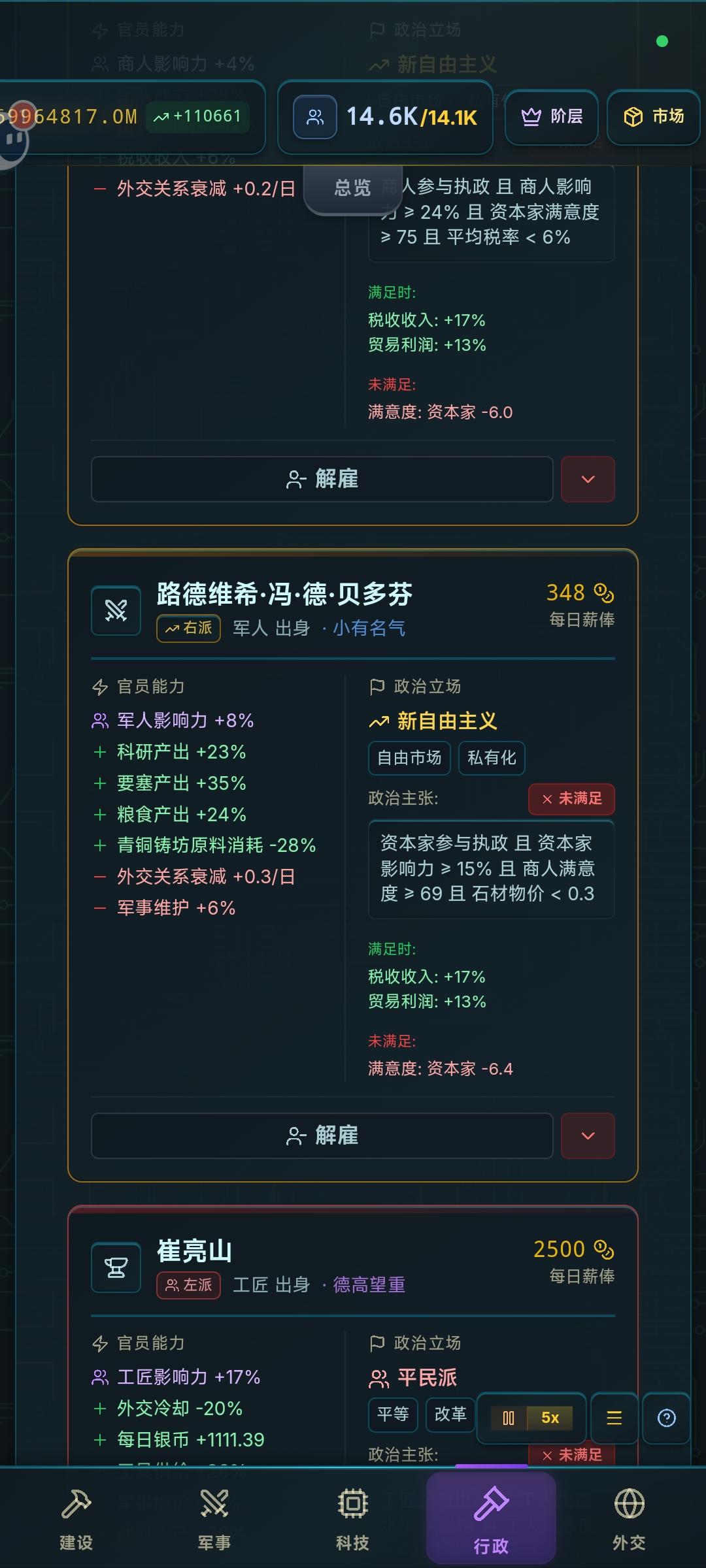 有个需要改善的点,粮食接近0时,居然还是没有人去种地。粮食价格也在6左右没变化。应该是游戏里,其它工种收益更高, 然后就各种阶级反叛了。这种物资极度匮乏还没人去生产的情况,尤其是粮食,不管是在现实,还是在维多利亚里面,都是不会出现的。粮价不应该有上限才对,价格增长曲线也应该更合理。
