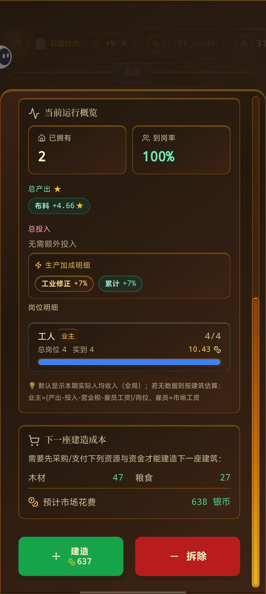 原材料基础讲解1.粮食,粮食的话是优先需要建的建筑,粮食的价格最好稳定在1~1.5之间,不太建议跌破1,否则自给农和佃农根本赚不到钱,地主哐哐挣钱,然后地主因为挣到钱过后,地主的需求应该是这个游戏中最高的,就框框的买各种各样的商品,然后哄抬其他商品价格,我推荐的一个建筑是50个农田,30个庄园,不需要工业化过后的机械化农田,我的农田加成是1187%庄园加成是1186%粮食应该是最好增加的产量,只