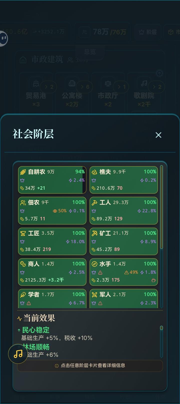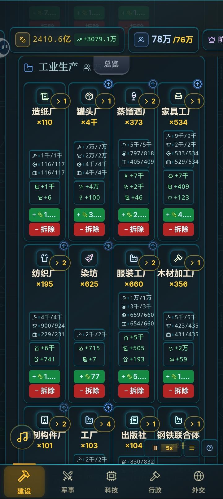 只要食物足够,这人就疯狂生,全面吸收了几个国家后,人口上限太高,把所有人口措施都拆了之后,还有3000人口,然后原住民不断地生失业者,为提供岗位,建设施,结果其他阶级又不满意,之后又是阶级矛盾,联合判乱,但又有很多食物,人杀的没生的快,同时又不断有国家攻击,最后直接顶着判乱,只攒钱,还升了两个时代,之后拆了所有措施,人死光了,但一建农田,人又开始生,又开始有失业者,算是死档了。