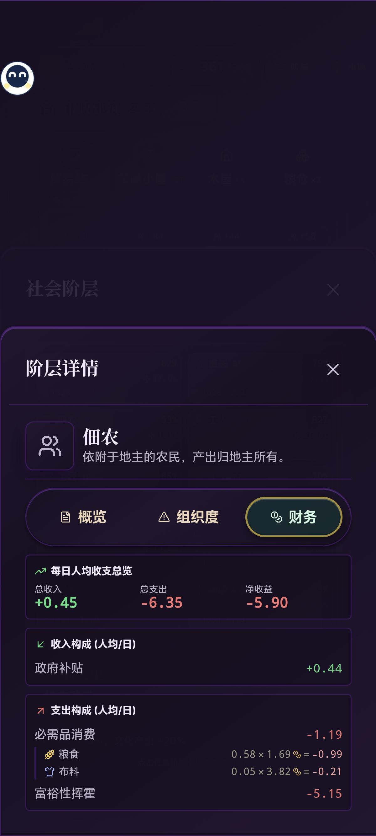神经,这富裕性挥霍真是恶心啊,纯属官方用来恶心玩家的。你压物价,好,我们设置一个富裕性挥霍,让你的人在温饱线上徘徊。不压物价,好,那就别想往其他国家卖东西了,你,只配买。请问这个富裕性挥霍到底是花在了哪里?明明没有买任何东西,无论物价如何雷打不动。烧给官方了?无论什么职业、无论什么收支水平,一到小康就固定花个五块左右在“富裕性挥霍”上,这合理吗?来,回答我!