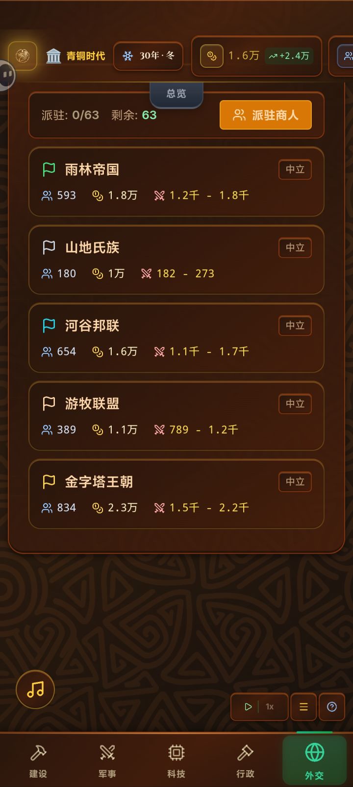 有点简单,前期只要多放建筑赞银币点科技,不要出现人口空闲就行,出兵最好是有100人口时再出,不要忙着升级时代,等发育到目前最好再进入下个时代就行,我这个是稳一点的玩法,激进的可以中期一边种田一边打仗,打到吞并为止,吞并前记得升级建筑物。切记查看市场上的资源存货和银币,不然容易破产,破产后很难发展起来,除非你读档。