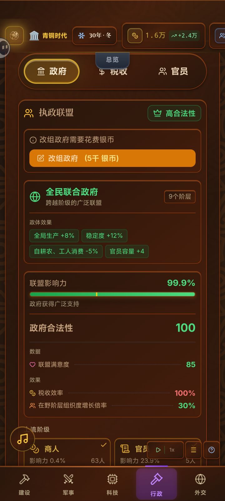 双减核心:减建筑成本;减居民需求开局:大力征税发展军事,趁着开局打下大量附庸官员:选择减全民需求与建筑成本的,叠到100%建制派占比到60+后,开启改良法令尽量选择减需求,减成本的现在,我们收入爆满,而建筑成本与居民消费却很低附庸经济起来后,拿钱给阶层减税发福利市场物资充裕,人民幸福美满