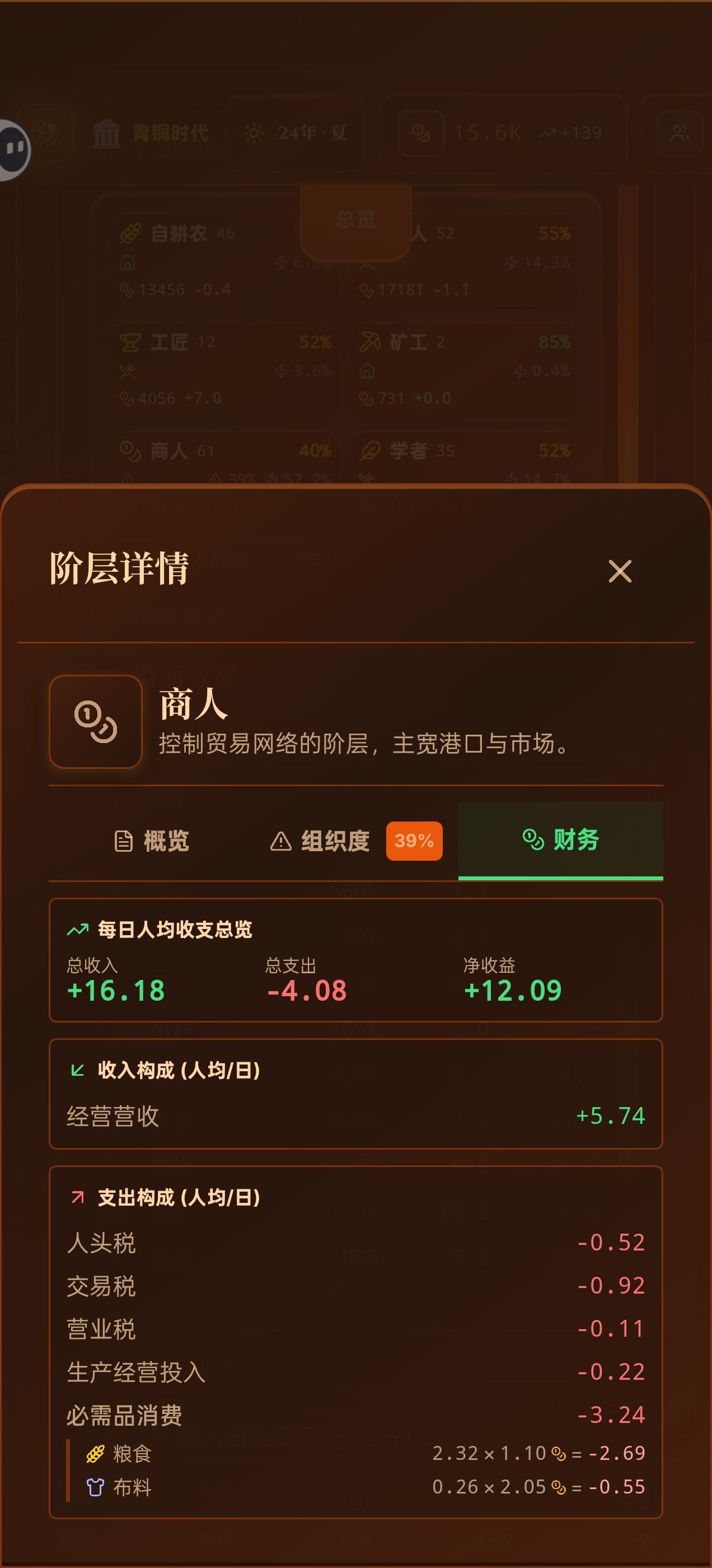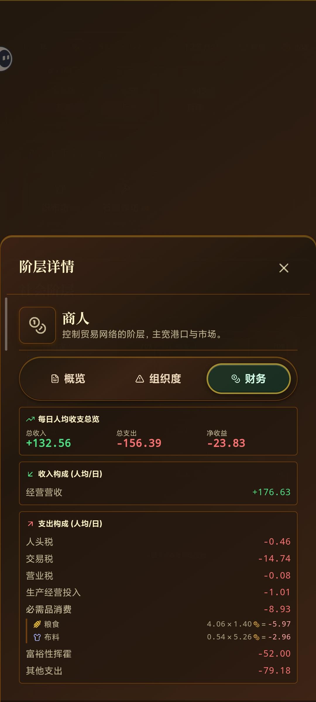 两个模块,前面分析,教你开局无商人日入百金,初入封建日入万金,后面有轮椅教程:第一块:此游戏非战争手段盈利关键在于积累财富何意味?1.减少人口流出、频繁和死亡,因为跑了会带走财富2.减少商人低价买入高产值物品,尽可能自产自销3.自给自足的小农经济经过资本入侵会发生什么?天朝上国早在历史课本就给出答案,何况前期还没自给自足有些人就想着发大发难国财了。原来农民和工人卖的商品价格变低了,他们
