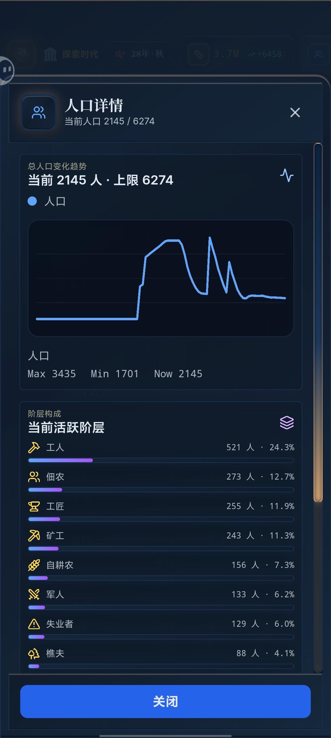 只要食物足够,这人就疯狂生,全面吸收了几个国家后,人口上限太高,把所有人口措施都拆了之后,还有3000人口,然后原住民不断地生失业者,为提供岗位,建设施,结果其他阶级又不满意,之后又是阶级矛盾,联合判乱,但又有很多食物,人杀的没生的快,同时又不断有国家攻击,最后直接顶着判乱,只攒钱,还升了两个时代,之后拆了所有措施,人死光了,但一建农田,人又开始生,又开始有失业者,算是死档了。