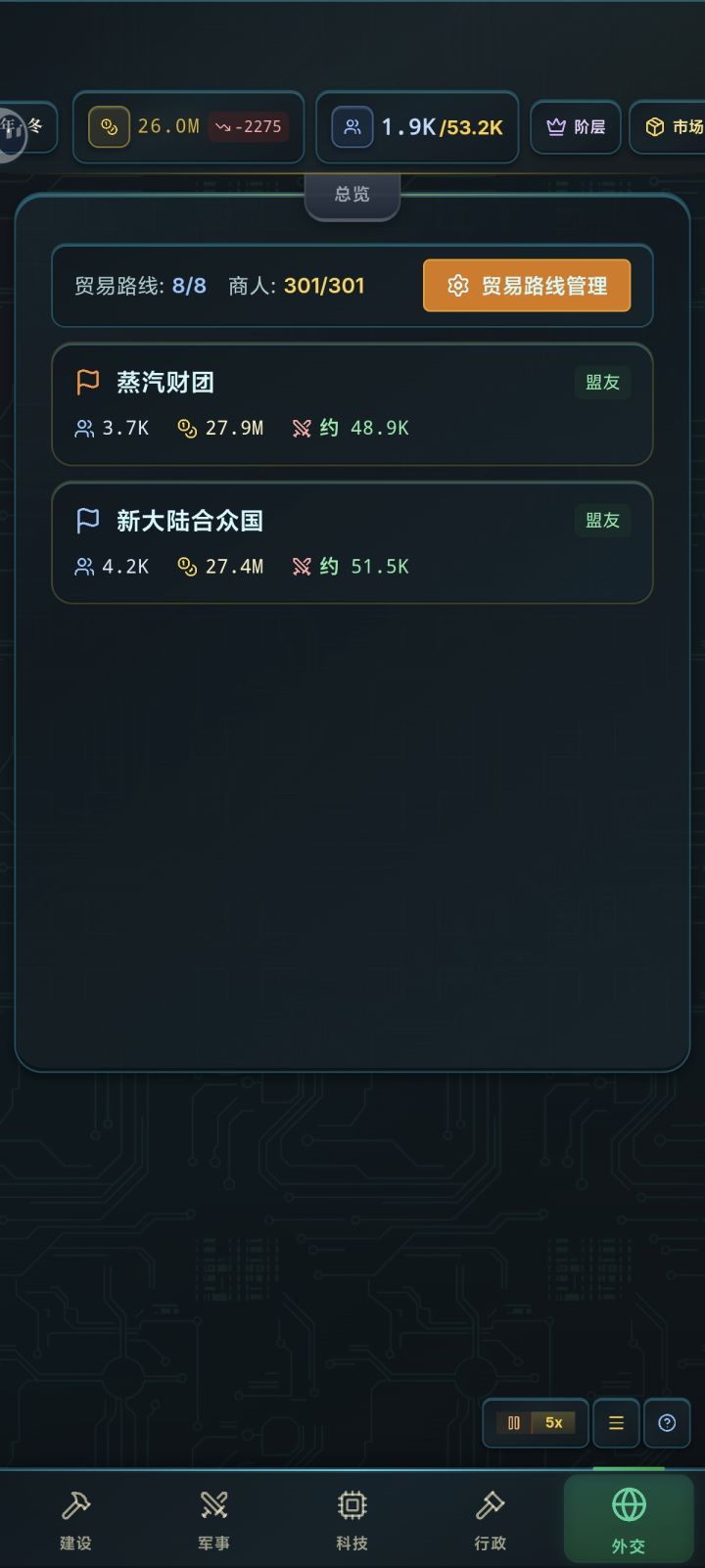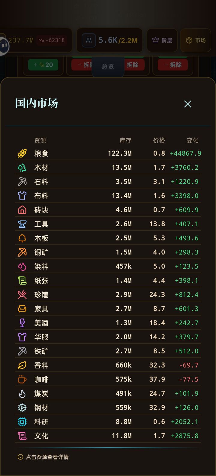税收:开局将将所有商品的交易税拉到20,后面解锁一个商品拉一个到20。这样就不会缺钱。建设与市场:建设是为了更好地满足市场需求,你要保证市场中的每个商品数量都在增加,特别是食物和布料。 简单来说,哪个价格高了,数量少了就建哪个的生产建筑。具体价格是高是低可以去与其他国家对比。军事:一个兵都不要,有人打就求和,然后再送礼。贸易:只进口不出口,因为我们是高税收,所以我们不缺钱只缺资源,有资源就