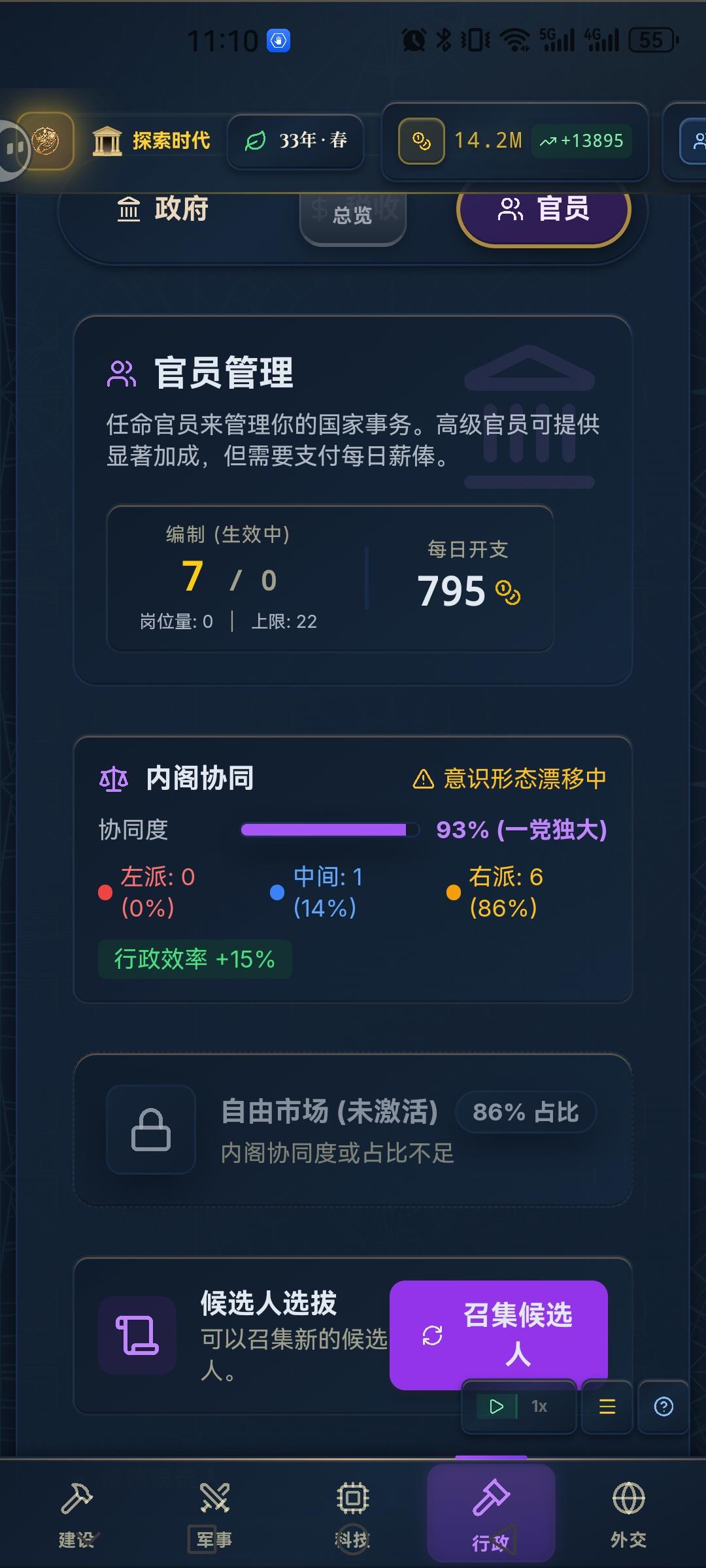 今天出了个官员系统 然后我发现政令系统无了。然后我的粮食产量远远大于需求量但是一直没人产粮食。求解。