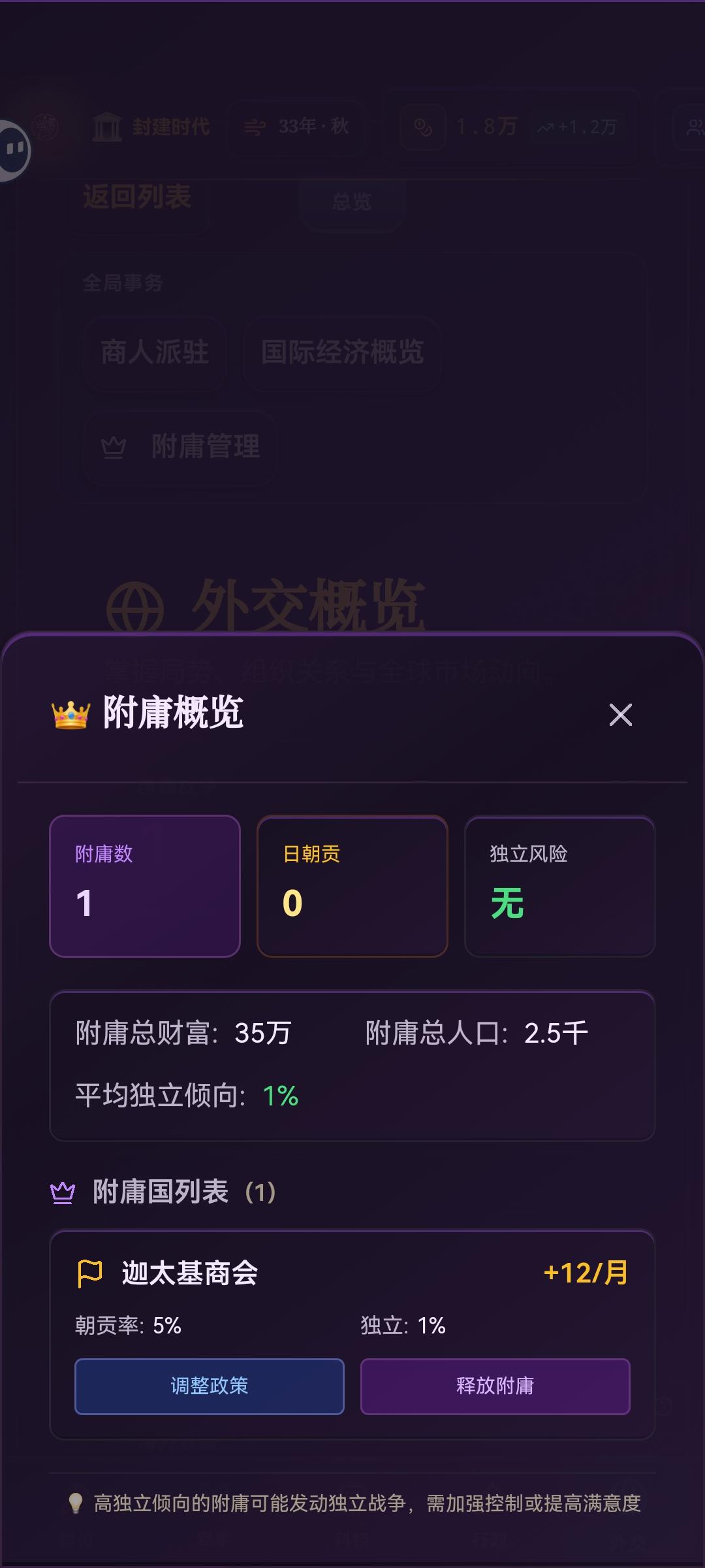 不知道又触发啥了,点管理附庸就会变成这样,啥都点不了。重进再点管理附庸还是会变成这样,试着从外交概念的附庸管理试了一下依旧没用。很影响体验的bug