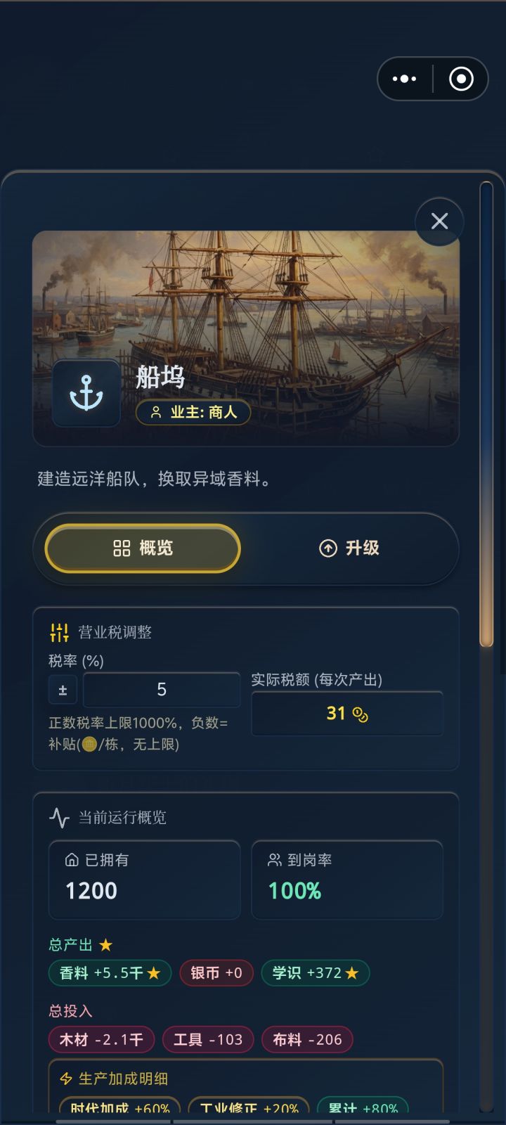 港口消耗木板,产出的银币归属业主,但是业主的工资里,只显示了0-雇工工资-木板成本,没显示他获得的银币。以及建筑的银币产出显示为0,容易让人误解,你钱去哪里了?