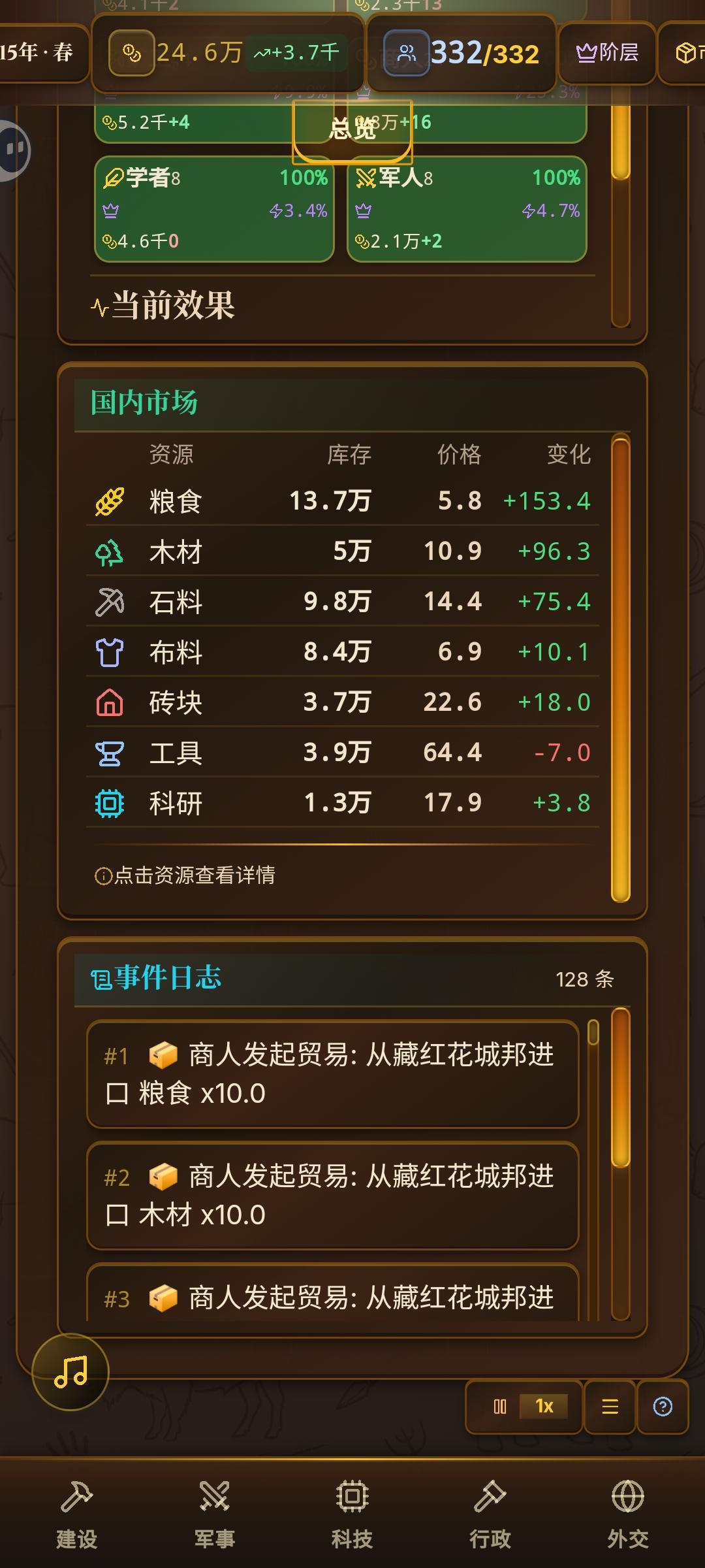 我想说作者做出了那么好的商业循环系统,应该添加一点经济的玩法,我用的几个小时去试图搞经济战争商人去给对面上强度比如说造成对面物资短缺之类的,但是反复的尝试也无法做到,我的理解是不是我的操作问题而是作者这方面没有做好我做再多他也无法购买我想要做的那个物资短缺的效果,AI在这方面完全不受影响,我开战争也好。用经济战也好,无论如何,除非我把他灭了,不然的话造不成什么影响,而且应该引入新的AI势力,嗯,简