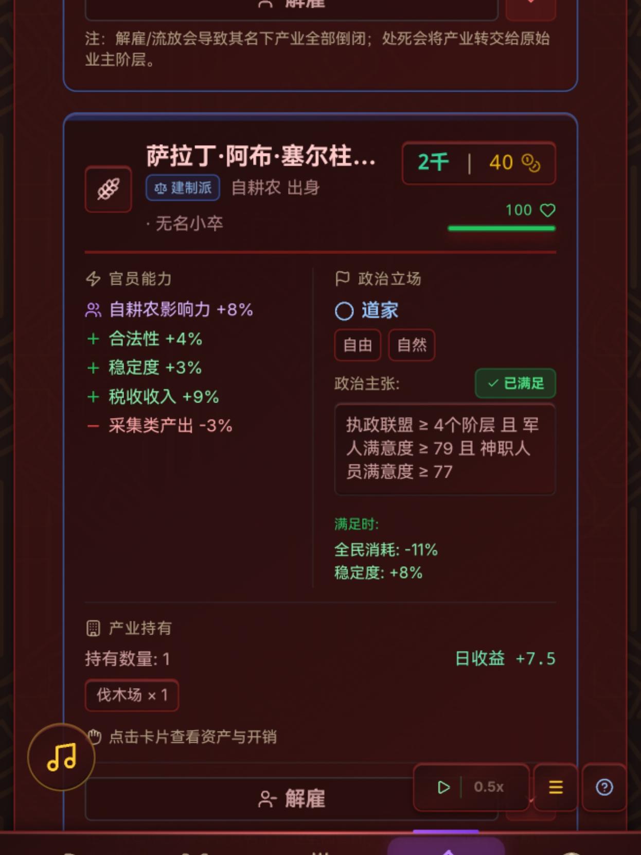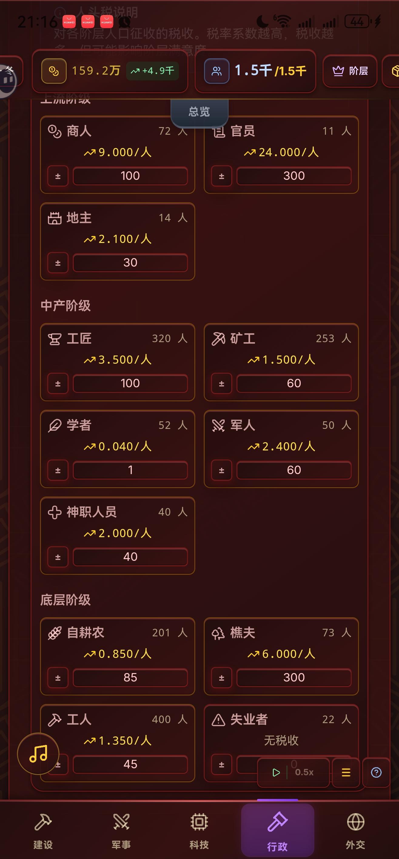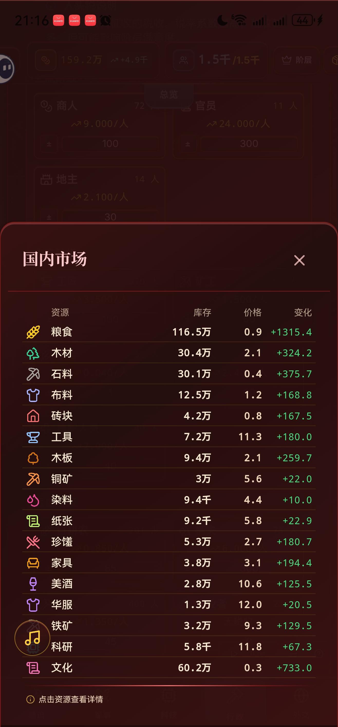 也是写上攻略了,哈哈,非常好玩的一款模拟经营游戏,给大伙讲讲我发现的焚诀。游戏刚玩有个痛点应该是解锁地主的时候吧,珍馐的价格居高不下,然后地主要吃两份珍馐,奢华生活要吃2.75,于是地主阶层无限地重复破产,导致我们根本收不到地主的税,这种情况到出了罐头厂可能才有点好转,因为铺一两百的珍馐坊都没办法把珍馐的价格压到5以内,有人还说地主阶层卡bug了,一会有一会消失,实际就是国内的地主阶层在不断破产