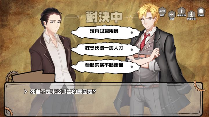 一点小攻略:探索房间,死者身上(证件,腿间粉末,口吐白沫,头上伤,还有一个啥忘了,总之3个√),左手房门,双人床,衣柜旁,洗手台水龙头,右手边红框(窗台)对决选项,前面多选选后三张图,下面依次选“没有吸食用具”“靠头上伤口”“躲避”“身无长物”不过对话真的蛮出戏的,还有突如其来的结尾,情节真是短小快😂。推理戏少,不相关的吐槽反而显得多,感觉有些对话有点多余了