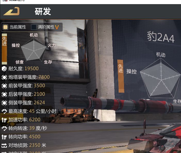 论豹4 豹4可以说是一个对于0氪和低特玩家比较友善的载具了。 1.属性方面豹子血量最高是19500【基础血量】但是如果加了涂装,科技,军官的话可以达到23000【MAX,除非有本命涂装套装和吉祥物。】豹子的速度算坦克中的佼佼者了加科技,和吉祥物【二周年蛋糕,白嫖吉祥物,二周年上线即领】可以达到48.9-49.5的样子。【普通的jeep最快也不过54封顶】豹子的转向算及格,随然没有勒狗那般变态,但是加了科技和军官后,可以同过转向规避大多数的导弹了。豹子的装甲是比较薄的【可以说所有的坦克,除顶级与盛会和挑战外都很薄,如果没有五星橙甲全套,说明你还没出村,有被屠村的风险。】 2.侦测方面豹子的侦测算优良的,对空是2180,对地是2350.但我的是对地2470,对空是2350。通常在天梯时与那些高血厚甲的坦克可以进行遛狗战术,【时刻看着距离,保持在2000-2300左右,保证自己处于不暴露与有视野的中间值。】。 3.火力方面:豹子的导弹和机枪相比于其他军需坦克是属于强项,遇到飞机骑头时机枪有足够的仰角去对付飞机,并且机枪的高射速可以大概率的打停飞机。火炮方面豹子中规中矩,7-6.8的装填配上快速装填的科技也可以经行不俗的输出。【豹子遇到高活力坦克比如勒狗就去卡射程,遇到高射程的重坦比如99于T-90就去卡视野。如果被重坦近身了也要时刻保持把前甲对准坦的炮口,应为前甲是最硬的。 总之豹子属于那种4边形战士,除了血薄以外都可以称为优秀。推荐的路线是游击路线。炮的属性推荐暴击,科技如下图推荐。