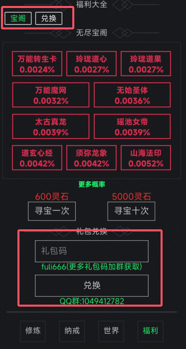 1.创建完角色后开局资源获取: 礼包码:fuli666 fuli888.5 fuli999/7 fuli251226 fuli251227 fuli251228 fuli2512292.怕麻烦可以跳过邀请码这一步。邀请码绑别人一次,可以被绑6次,可以去tb直接找小作坊完成六次绑定,3块钱左右。然后可以换很多的灵石3.最关键的抽卡最好是红灵根和红法宝的开局,因为这两个会抽出很多的时尚小垃圾