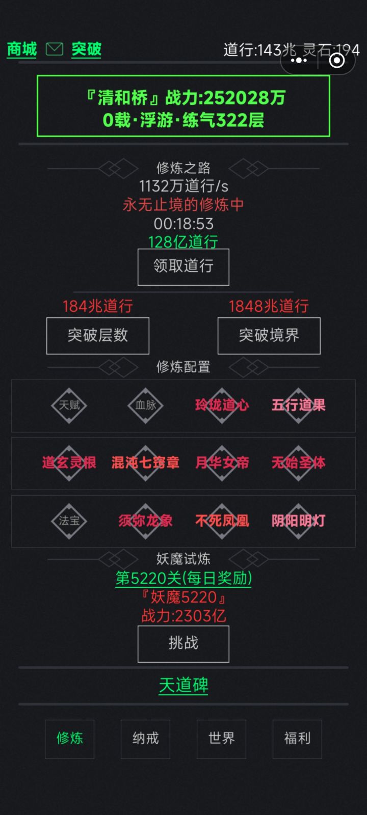 修仙999层”的核心玩法是通过在低境界积累高层数,从而在突破大境界时获得更高的战力加成和道源(本源)收益。以下是具体机制和策略总结: 一、境界层数与加成机制基础效率与突破加成每个大境界的初始基础效率不同,例如:练气一层效率为10,每升一层递增(如二层+11,三层+12)筑基一层基础效率201,金丹一层401,后续每层递增突破大境界时的加成:练气每10层增加1%道源,筑基每10层2%