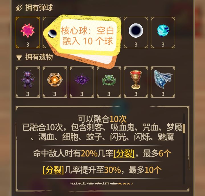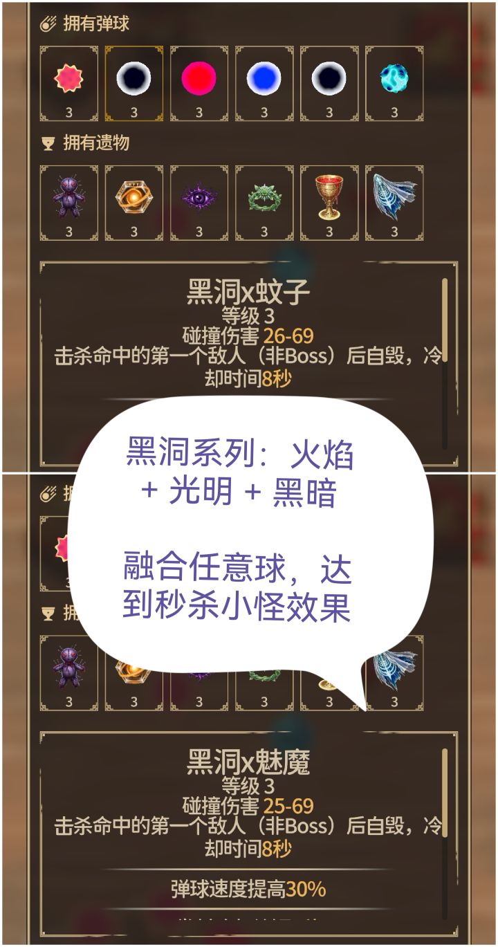 角色选极。关键点是空白球千万别融合黑洞和核弹这种消除的球。遗物和空白的具体融合可以参考图片。其他球全部用黑洞融合其他分裂或者范围球。(编辑的这会功夫,血量又涨了不少🤣发不了视频,视频更震撼,血量蹭蹭涨)