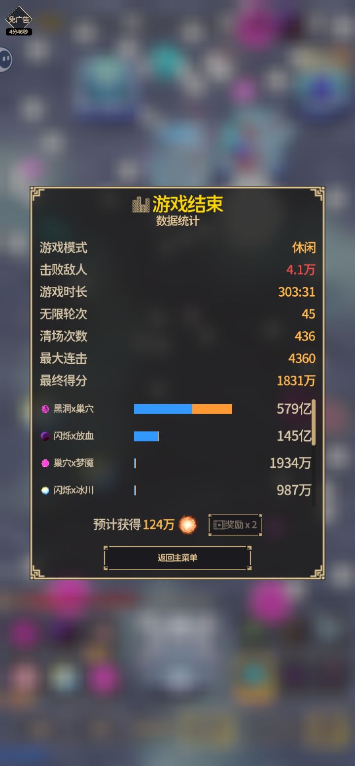 图是我自己投降的,太卡了套路挺多的,但后期游戏太卡了,游戏进程也太简单了,基本上熟练后两把通无尽吧。游戏优化感觉没有做好,非常耗电和发热。手机再好也扛不住。主要就黑洞流,魅惑流,放血流。先玩一个套路,根据需求解锁相应的弹球和遗物。到无尽一把几万成就点就可以基本解锁所有东西了。然后试试自己最佳搭配。