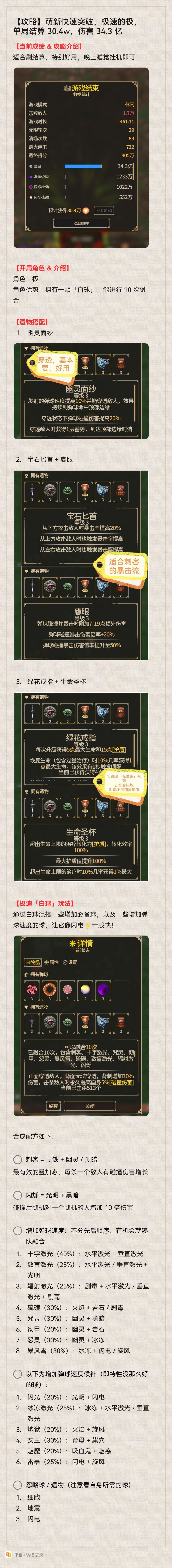 【当前成绩 & 攻略介绍】适合刷结算,特别好用,晚上睡觉挂机即可注意⚠️整体攻略图文形式在图 6,TapTap 上没法图文混编,需要整体看可以看图 6【开局角色 & 介绍】角色:极角色优势:拥有一颗「白球」,能进行 10 次融合【遗物搭配】 1. 幽灵面纱 2. 宝石匕首 + 鹰眼 3. 绿花戒指 + 生命圣杯 4. 巫毒娃娃(增加概率性秒杀)【极速「白球」玩法】通过白球混