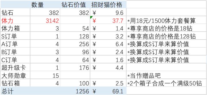 今天还在工位没事干,随便做了68元赛季通行证的性价比,以及钻石首充双倍的性价比。给纠结要不要氪通行证,要不要钻石首充的宝宝提供点参考。如果不打算氪金的宝宝,可以提前离开了首先看图2,整理了充值钻石的单钻性价比,最划算的是68元双倍首充。当然,这些都比不过每日招财猫的性价比,如果打算屯钻石的宝宝,可以每天固定氪招财猫,比首充双倍还划算图3整理了68元赛季通行证的所有奖品,价值