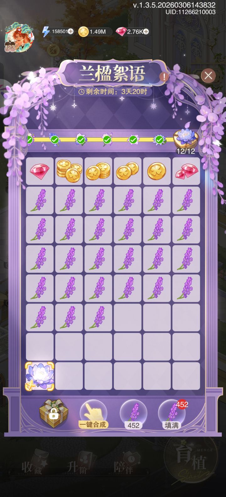 第一朵花有格子里系统给的各等级花,所需要的一级花是742朵,等于7420体力,点掉获得1314体力+一个赛季小卡+5到10级花各一朵。我们合成的大花是12级花,所以合成还需要1040朵一级花,等于10400体力。之后点掉获得3344体力+5到10级花各一朵。——————————————————————第一朵花消耗一级花:742朵(7420体力)获得:1314体力+赛季小卡+5级到10级花