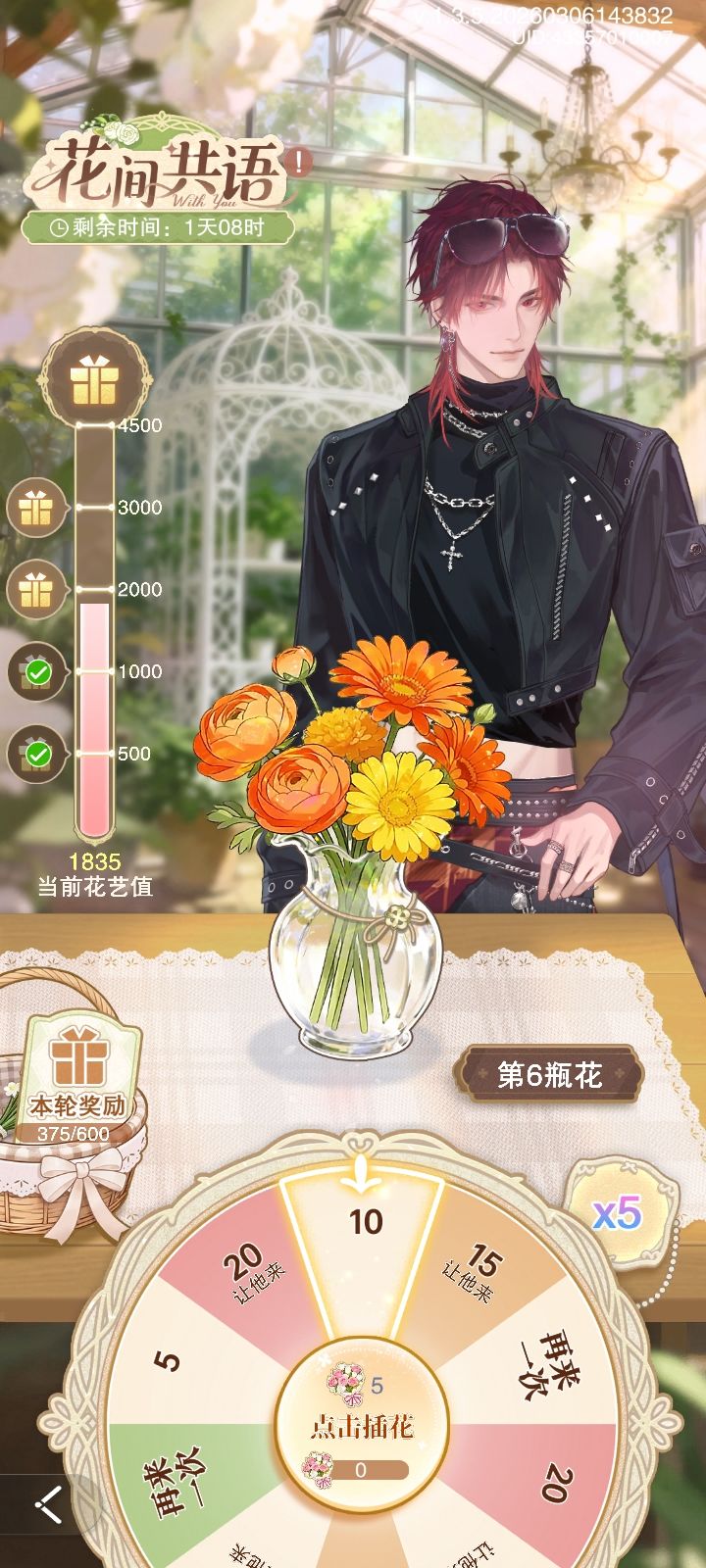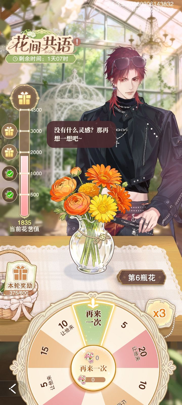 活动的*3和*5键在遇到“再来一次”的时候会吞花,如果是*3,就是浪费了两朵,*5则是四朵,建议改进一下。我的发现过程如下:按照活动设置,正常情况选一次插一朵花,那转到再来一次就会免掉一次,但是一般玩家会乘三,一次插三支,或者乘五,我发现如果我这次转的时候插了五朵,正好转到再来一次,那我五朵花就都没了,但是这个再来一次它也只免一次,相当于我花了五朵花但是只插了一次花,玩家运气比较好的话,总是抽中