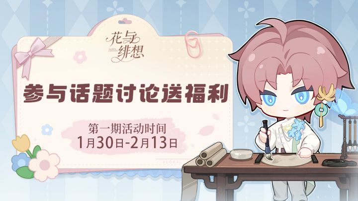 各位主理人:寒假已到,新春将至。小花为大家准备了活动福利!晒出你的《花与绯想》心动瞬间或成长足迹,即可参与抽奖,赢取体力补给~200体力 × 10名(每人一份)活动时间:1月30日 - 2月13日在本帖下方回复,参与以下任一话题即可:晒进度:分享你的游戏进度/卡池收集截图谈心动:聊聊你最喜爱的男角色,并说明理由(可附角色截图) 获奖名单将于活动结束后3个工作日内公示,请关注本帖更新奖
