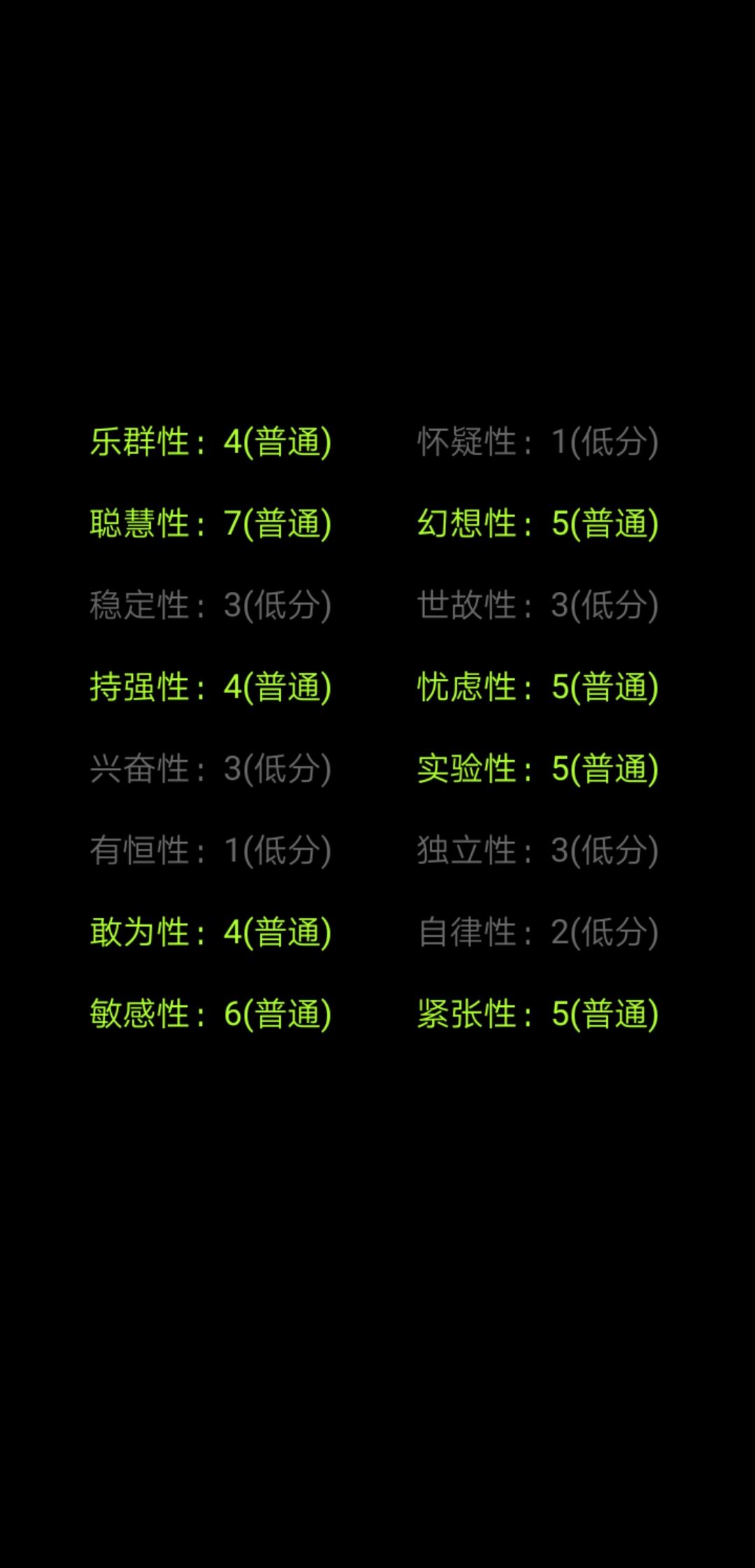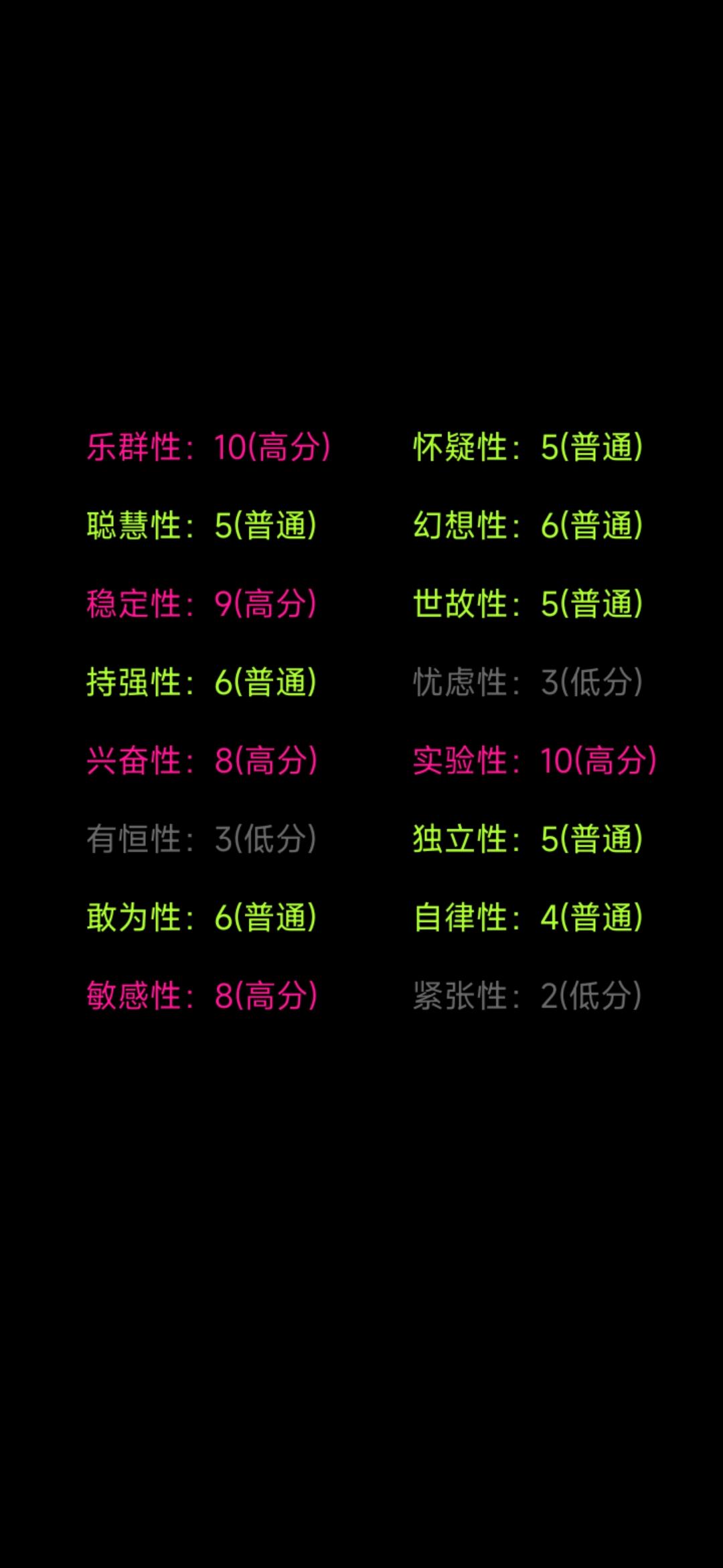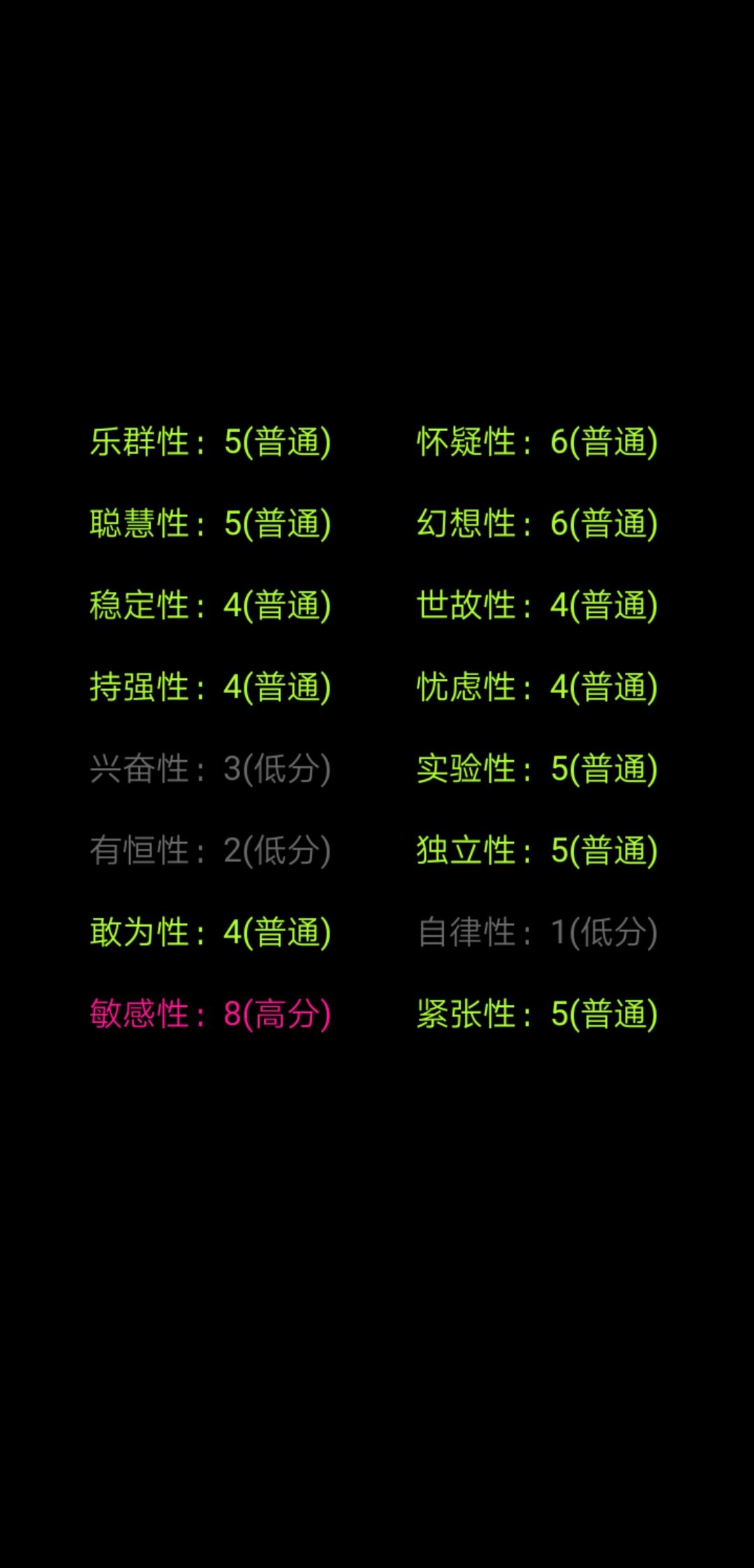 21年,高二的我胆小又较为自卑,懵懂无知下从好友那里被安利到这款作品,第一次玩的时候,对这种测试不屑一顾,当时抱着跟风的心态耐心玩了一个小时,做完的结果让我很不满意,很多都是灰色的,没有几项凸出的特性,唯一的高分是紧张性,一度让我截图都拿不出手…