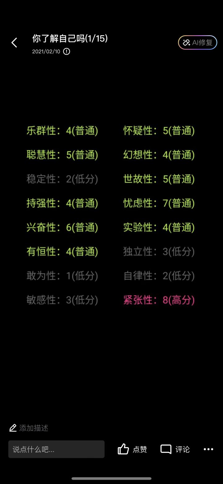 21年,高二的我胆小又较为自卑,懵懂无知下从好友那里被安利到这款作品,第一次玩的时候,对这种测试不屑一顾,当时抱着跟风的心态耐心玩了一个小时,做完的结果让我很不满意,很多都是灰色的,没有几项凸出的特性,唯一的高分是紧张性,一度让我截图都拿不出手…