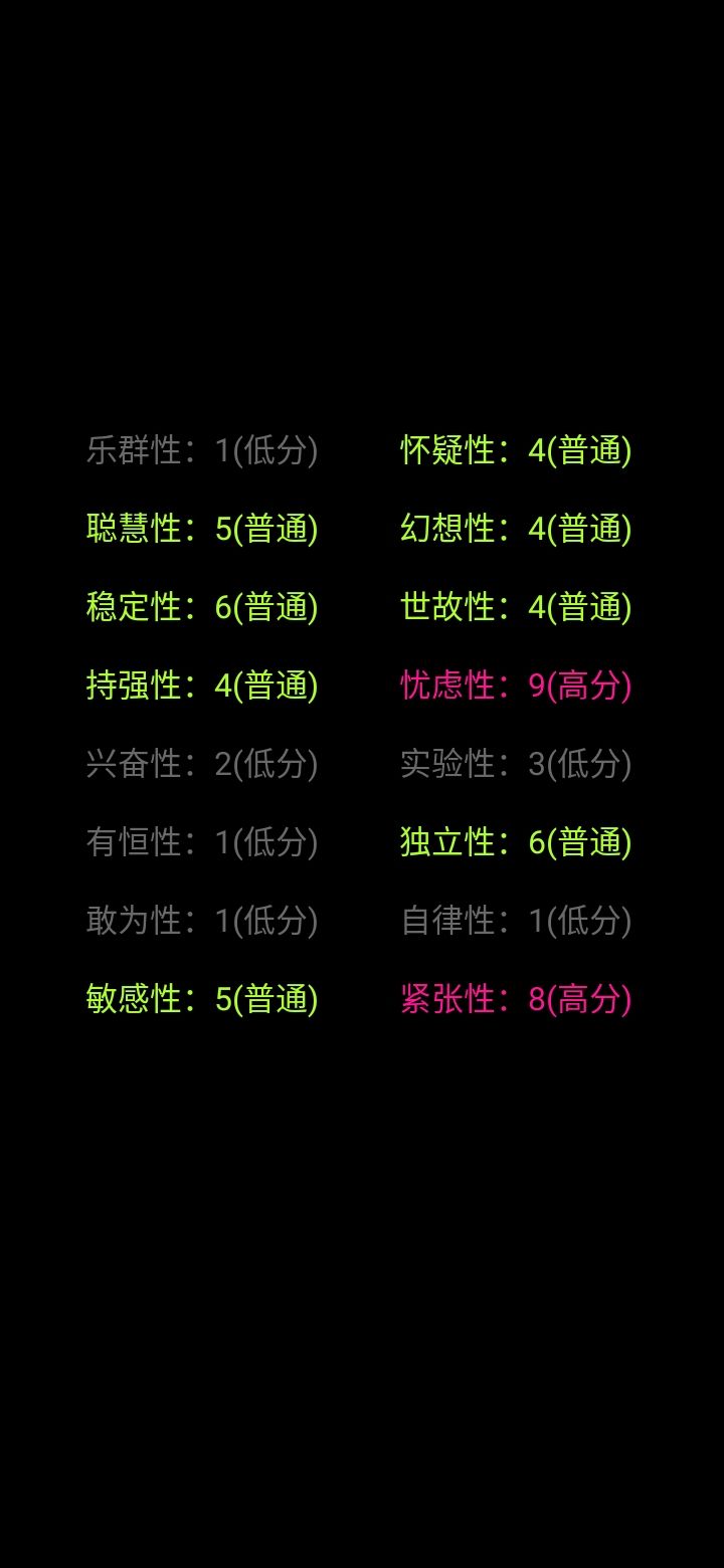 因素A乐群性:高分者外向、热情、乐群;低分者缄默、孤独、内向。 因素B聪慧性:高分者聪明、富有才识;低分者迟钝、学识浅薄。 因素C稳定性:高分者情绪稳定而成熟;低分者情绪激动不稳定。 因素E恃强性:高分者好强固执、支配攻击;低分者谦虚顺从。 因素F兴奋性:高分者轻松兴奋、逍遥放纵;低分者严肃审慎、沉默寡言。 因素G有恒性:高分者有恒负责、重良心;低分者权宜敷衍、原则性差。 因素H敢为性:高分者冒险