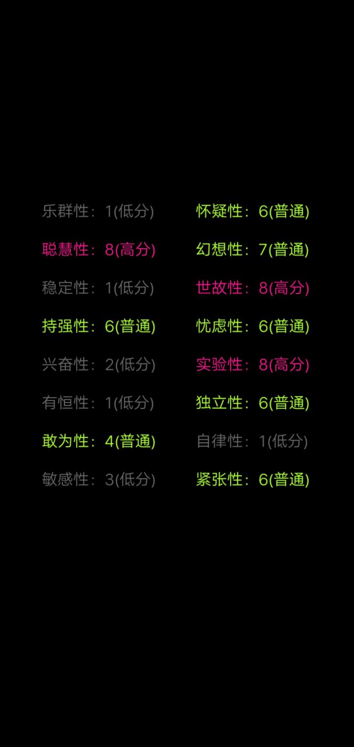 话说那个聪慧性是咋测出来的,夸我聪明,为啥我没有考上清华北大,985大学也行啊这个面板怎么看都觉得适合当个科研人员,巧的是我就是科研人员,真不错啊我MBti测出是intp和infp,和这个游戏的描述挺像的.感觉我对自己的认知,就是这样的