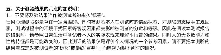 我没想过这么低,有点意外,不过我现在未成年,打算成年后再测一次看看然后就是有个建议,那就是题目选项可以回到上一题,因为我这个不小心点错了一题,阿巴阿巴…然后返不回去,然后我又不想在重新做180多题…大概就这样,分析挺全的,有些挺准,有些咳咳(我不承认!)有些结果还是蛮失望的(因为好的那些差不多都低分)等成年再测一次吧,说不定不一样,还是挺喜欢这个的