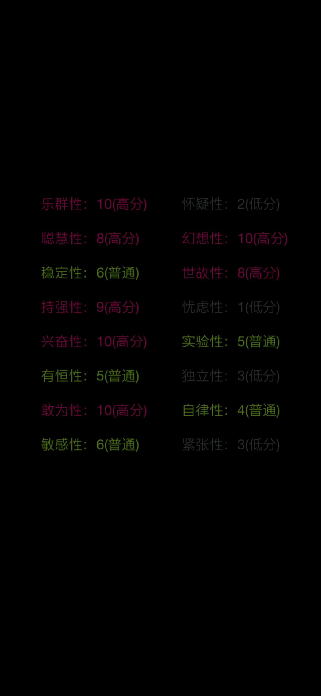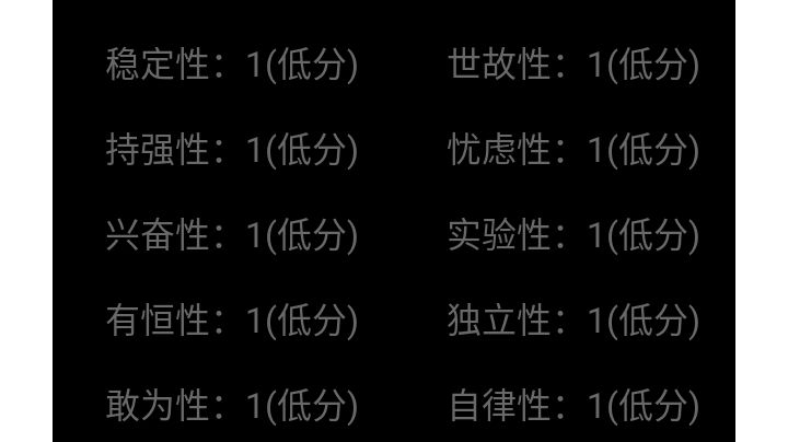 唔……与我现实中的样子完全相反,但是我确定了每一个选项都是我认真选的,除了偶尔几个没看清题目,手滑点到了的,嘶……嘛,真的是低于普通人啊~