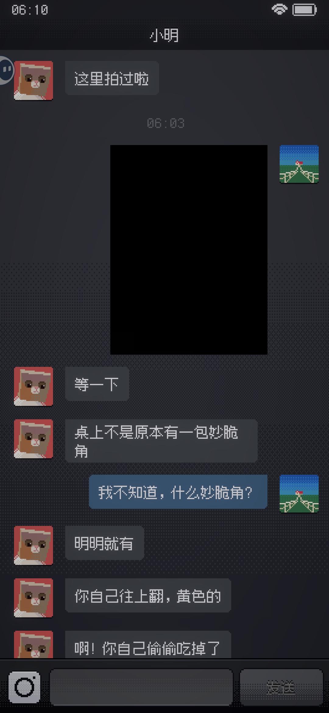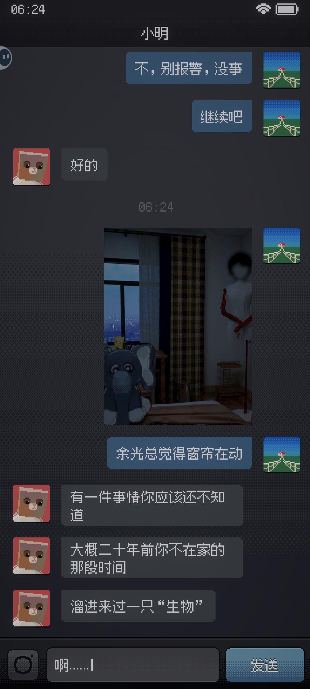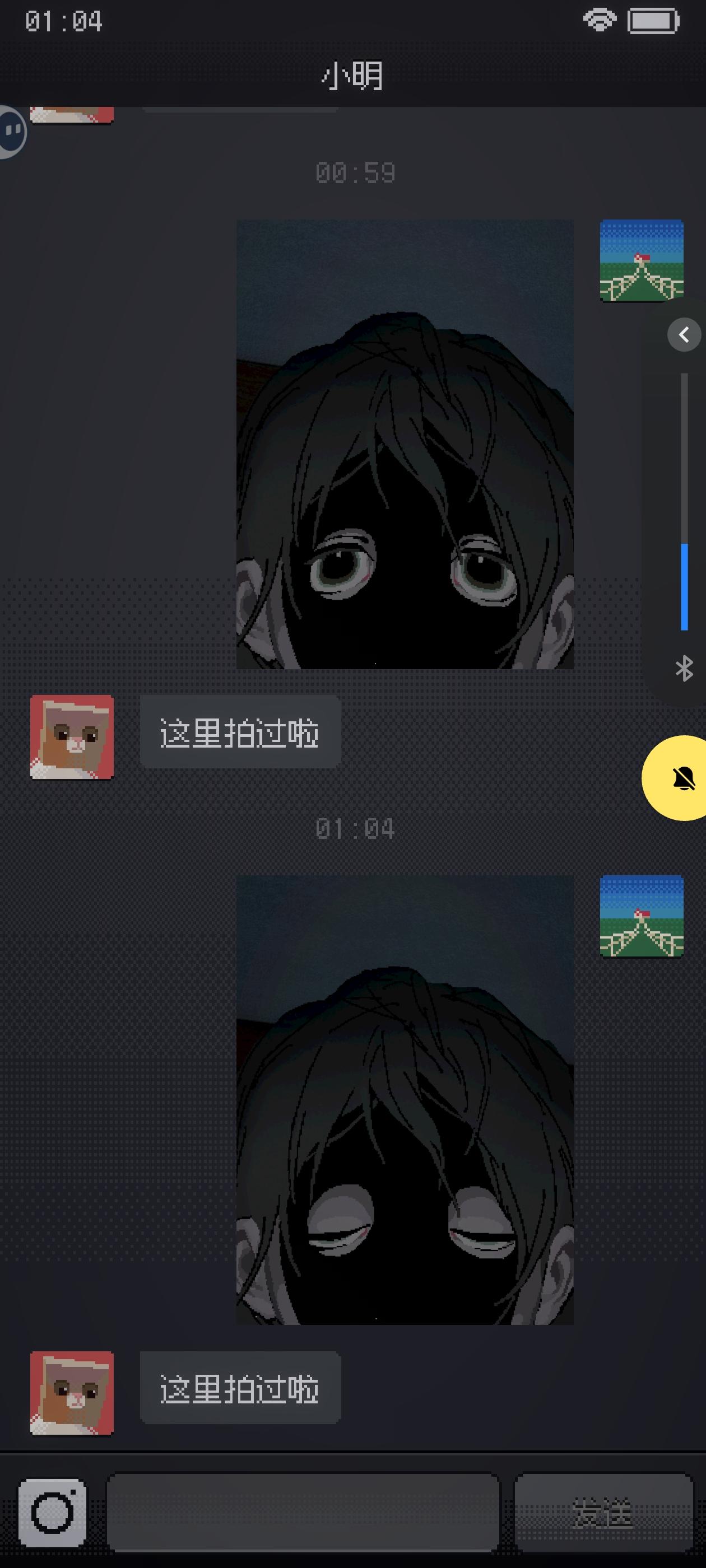 全景拍照的模式比那些点击放大看的恐怖游戏要有代入感,这样出现的变化也让人挺在意的。聊天也很让人心里毛毛的,一开始想主角和小明大半夜聊天还能开恐怖笑话真是心理素质好,这种人居然会看完恐怖片吓到吗(不如说这种擅长立flag完全是恐怖片主角的好本领啊!!!)看到后来hhh原来大家都不正常那没事了(。)唉,主角,唉,小明。精神堪忧呢主角酱。不知道为什么总感觉这里并不是真实的,主角像是在被心理医生催