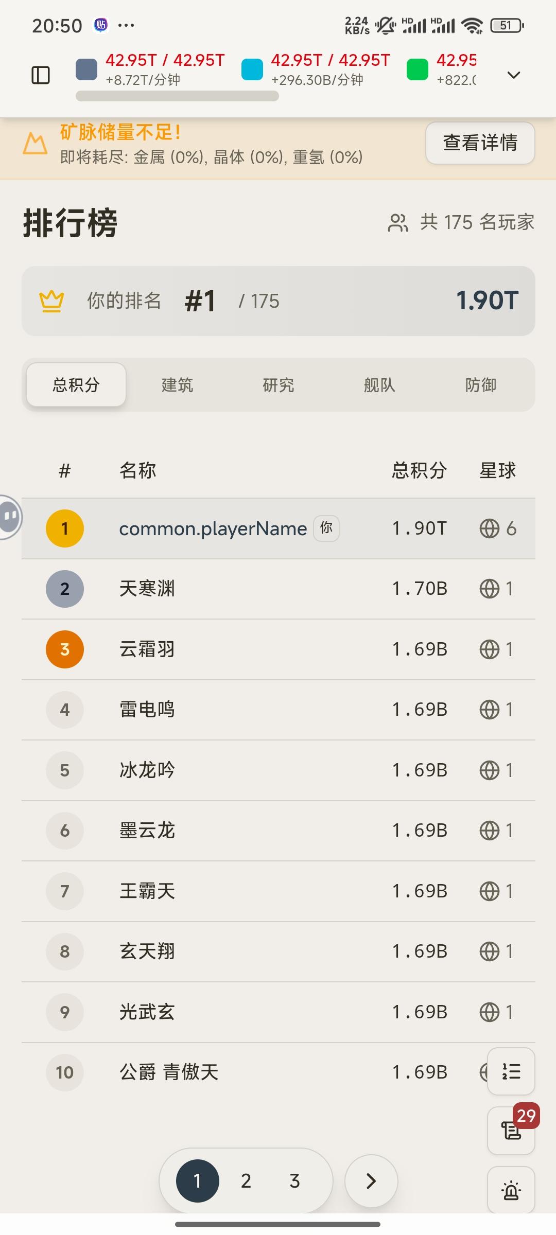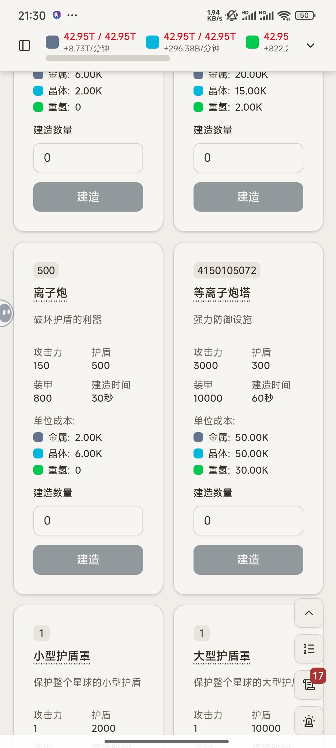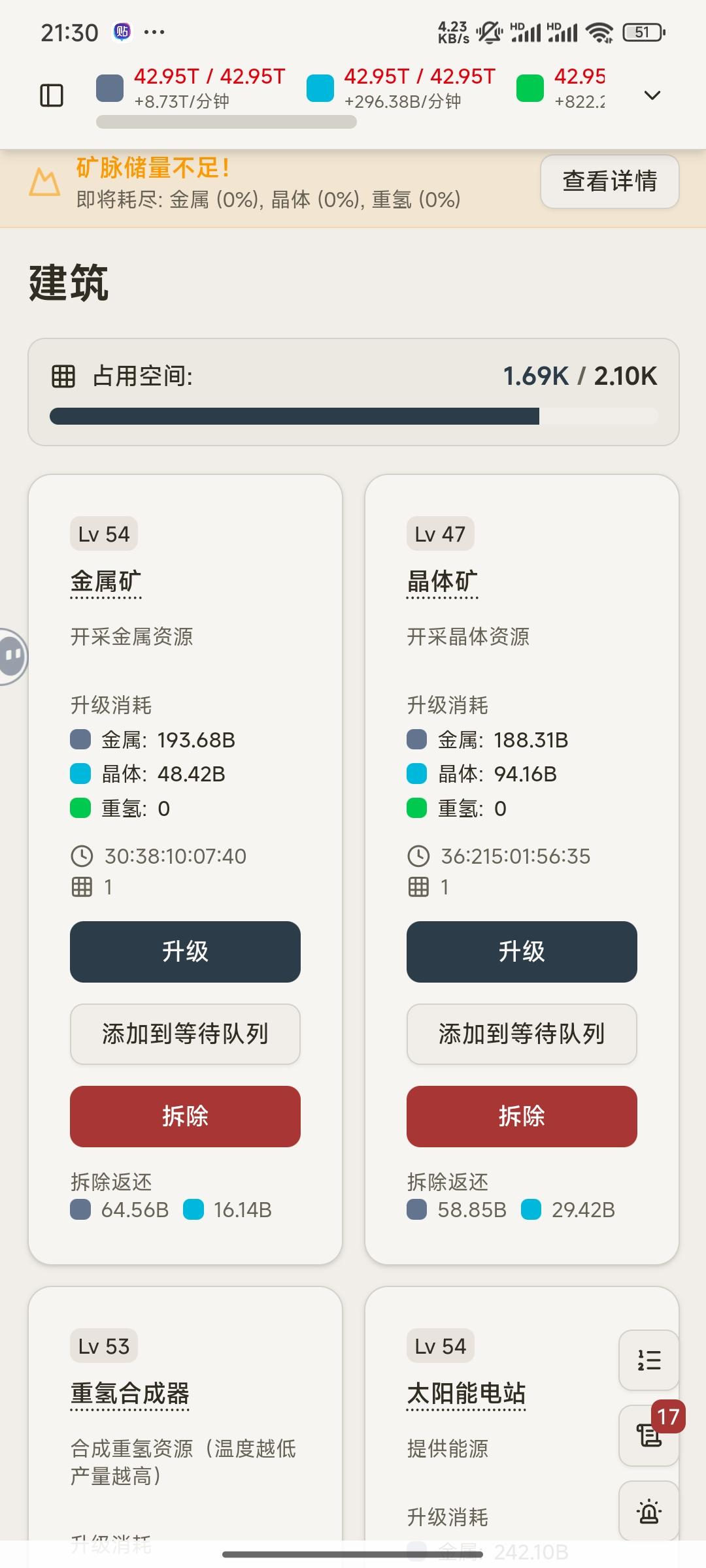 正常玩了一天才从倒一到倒二,然后用了时间大法把能拉的都拉满了,因为手机最高跨度就二十多年,后面的升不了了。总体而言内容并没有多少,怀旧经典。建筑等级越高分数越多,不过实际加成是线性的,多升几级科技也不会有质变,舰船最多也就造到死星。资源枯竭这个东西,虽然实际产量下降了,但是继续升矿产量它还是会继续升,所以能升就升。每个舰船占用都不一样,战斗类的从最低的5个空间到死星的100个空间,所以舰船其