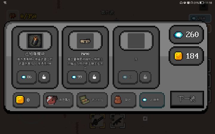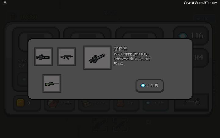如图,第一个问题,到达第九波和第十波的时候,刷新开始出现大量空白,第二个问题,状态机提升的升级顶级变成了三级?我依稀记得上个版本我还差一级升满来着???第三个问题,加特林出售价格是一点,虽然我估摸着作者觉得不会有人出售加特林所以就偷了个懒,hhhh~AWM狙击枪加上穿透子弹真的变成了无限穿透,这里给个好评。最后一个问题,好像是所有枪都通用的,不知道是不是移速过高导致的,狙击枪表现的尤其明