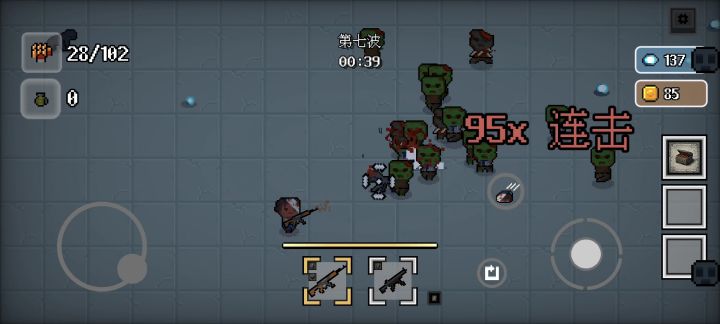 攻击摇杆可以改成手动攻击,攻击按键不要固定可以自行设置,放大或者缩小,机枪开火有时候闪退,近战武器前摇太大,换弹掉移速有点坑,刷怪不规则,因为视野不开阔突然刷在脸上,瞬间残血,近战武器可以多加几个,如棍子的横扫附带几率眩晕,长枪的直刺附带几率暴击,加把大刀横转一圈,可以做成一个小技能(类似闪避,闪避也有前后摇,怪的移速太快,翻滚过去就挨打),可以加个RPG什么的枪械,投掷物加点闪光弹燃烧瓶,过个几