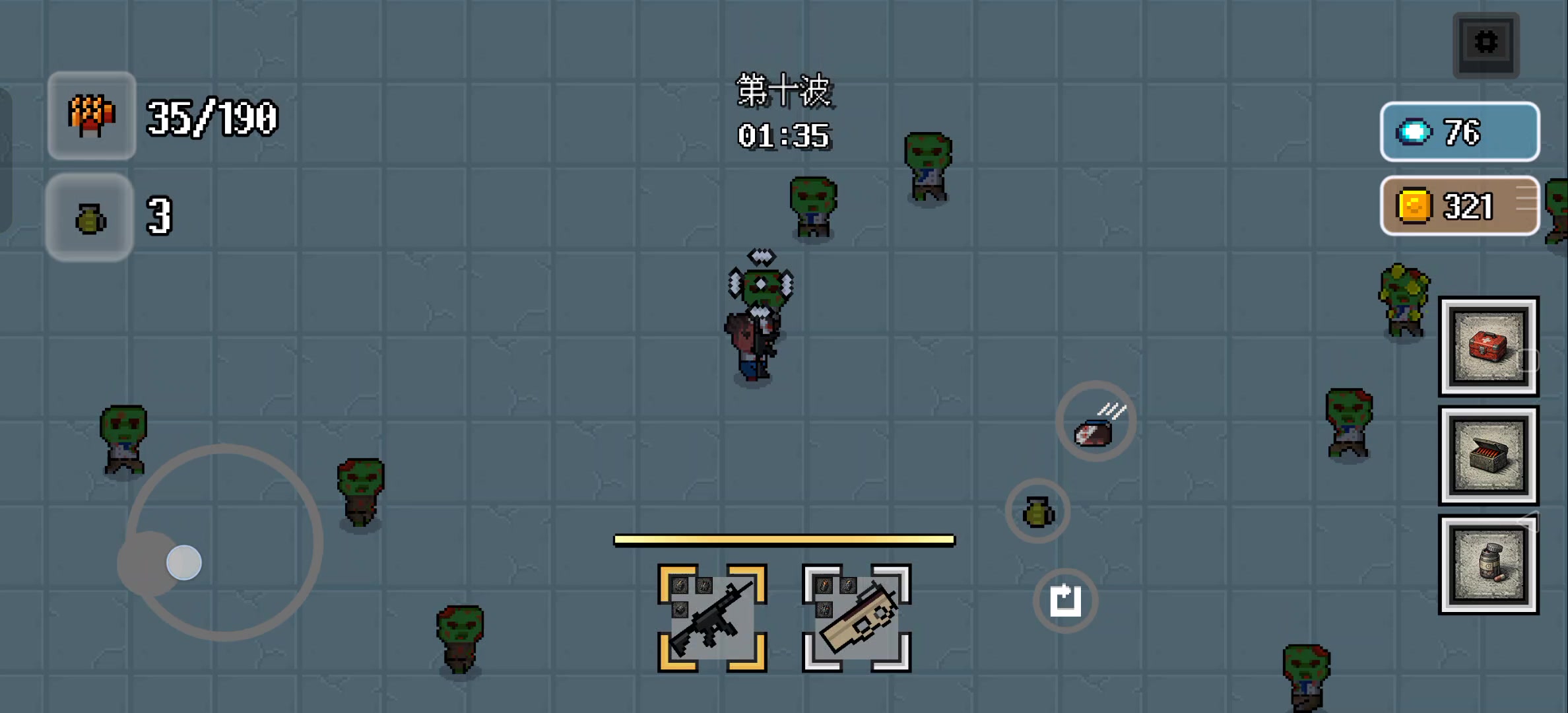 攻击摇杆可以改成手动攻击,攻击按键不要固定可以自行设置,放大或者缩小,机枪开火有时候闪退,近战武器前摇太大,换弹掉移速有点坑,刷怪不规则,因为视野不开阔突然刷在脸上,瞬间残血,近战武器可以多加几个,如棍子的横扫附带几率眩晕,长枪的直刺附带几率暴击,加把大刀横转一圈,可以做成一个小技能(类似闪避,闪避也有前后摇,怪的移速太快,翻滚过去就挨打),可以加个RPG什么的枪械,投掷物加点闪光弹燃烧瓶,过个几