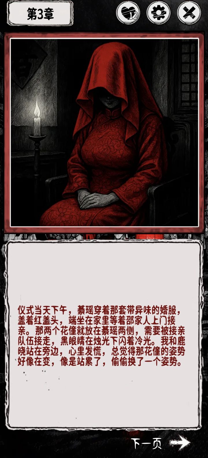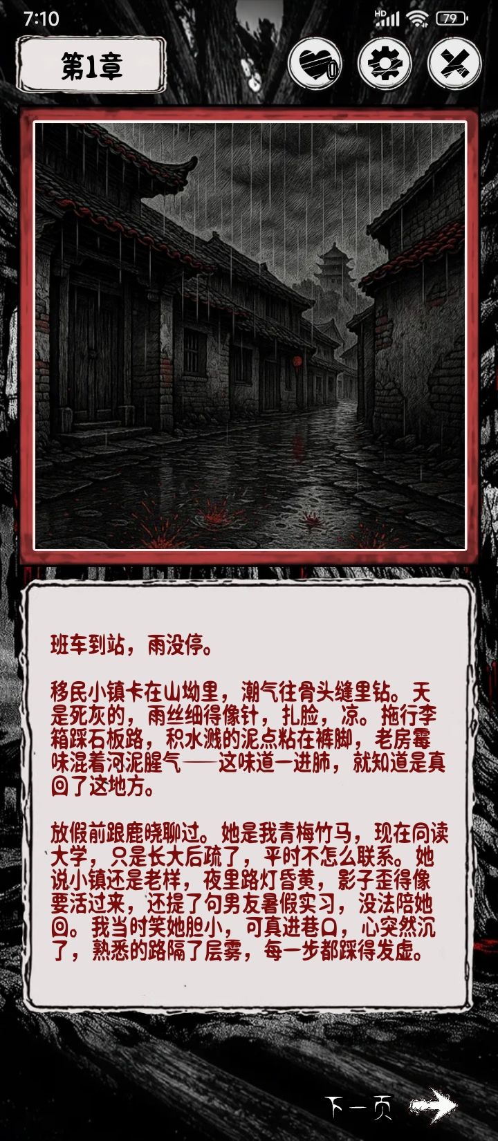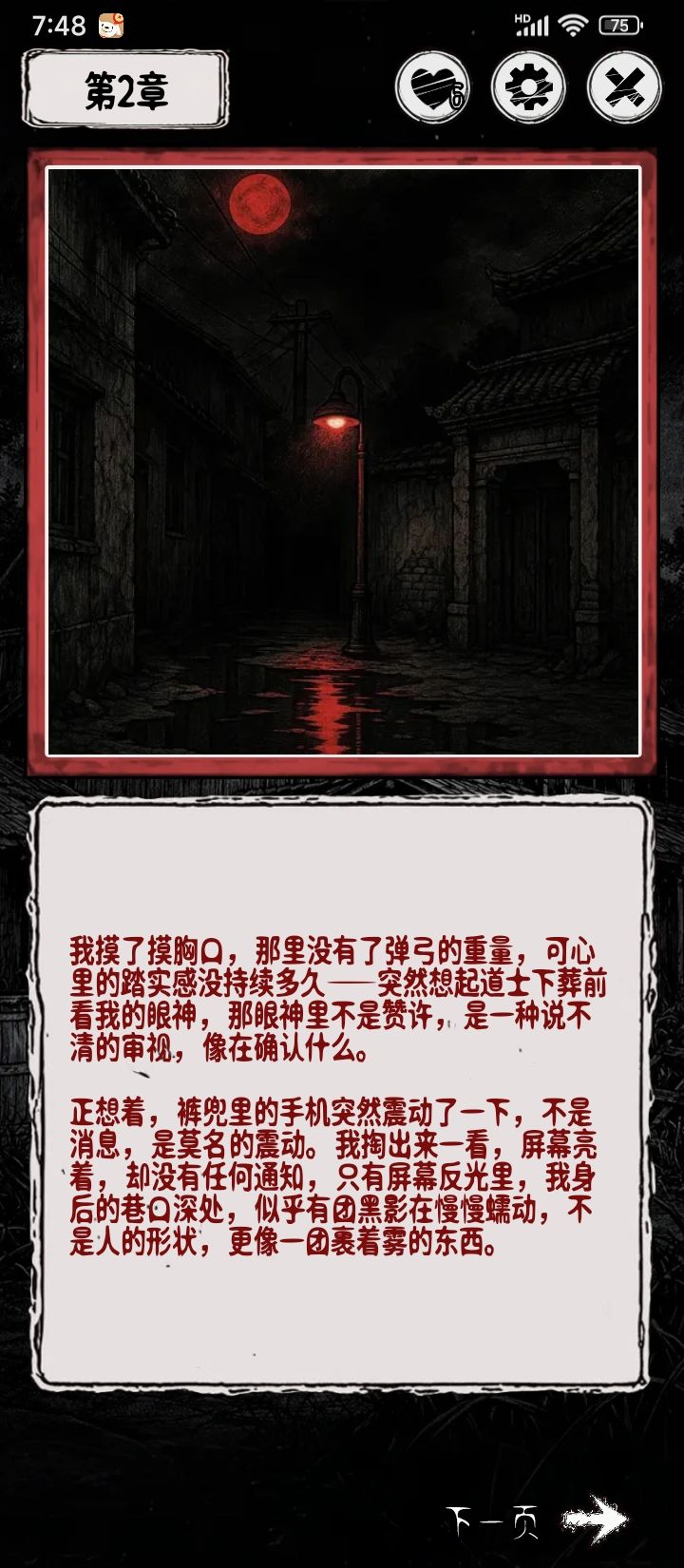 中式恐怖题材的文字冒险游戏,以文本阅读为主,有真人语音自动阅读,语速还可以咬字很清晰。剧情有选项分支,有些选项选错就会GAMEOVER,只能从章节开始再从头来过。没做基础操作介绍,直接点击下一步和选择即可,都是中文界面很容易懂。