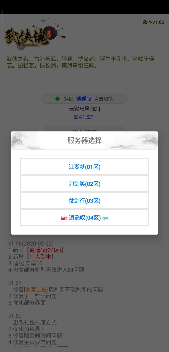 新版?更新了什么内容?《武侠魂》v1.66(2020-02-22)更新内容1.新区【逍遥叹(04区)】2.新增【单人副本】3.适配 安卓104.修复部分机型无法进入的问题