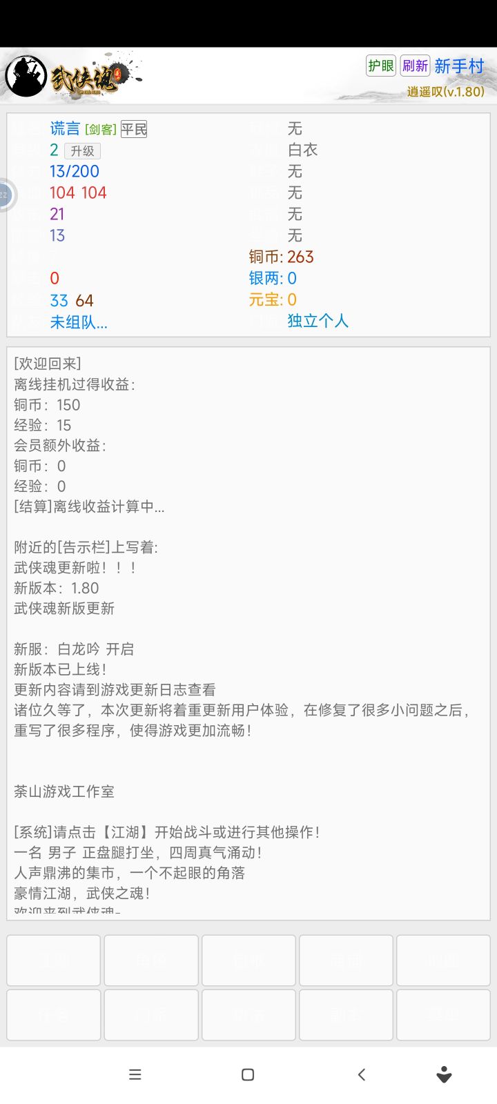 本次更新,更换了服务器,所有玩家必须更新,旧版已登录不上,请各位侠友尽快更新!卸载游戏会导致游戏数据自动删除!(直接覆盖安装)名称:武侠魂新版:1.51大小:10MB左右下载链接:https://www.lanzous.com/i432qmh友情提示:礼包中心有礼包可以领取哦!