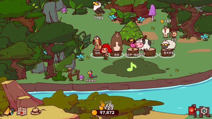 新领养的动物会出现在属于它们的默认生存区域。鸟类就都在丛林里。但是你可以随意移动它们的位置,脱离原本天然的自然环境也是可以的。以中心的营地草原为中心,衍生出去很多不同的自然区域,像是雪山、丛林、萨凡纳(稀树草原)、蘑菇森林。另外还有“风之丘”和“回声洞穴”这两个需要付费解锁的特殊区域。在这两个区域内叫声的音调会产生变化。回声洞穴其实也不是真的有回声。就是音调变了,听起来有点像回声。合唱团和统一叫声的服装也可以购买。